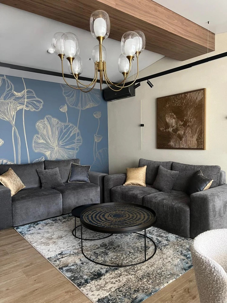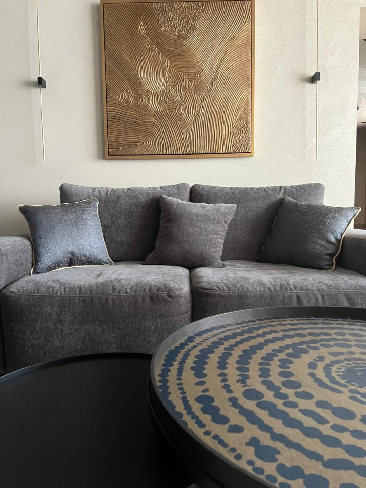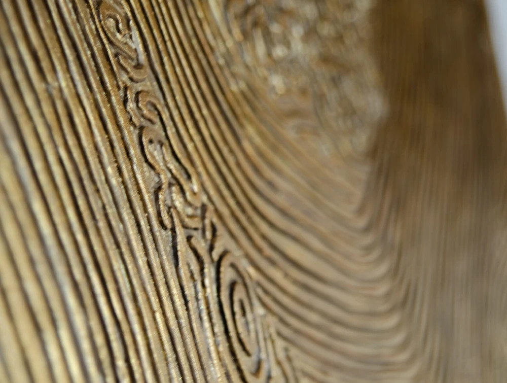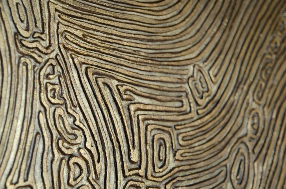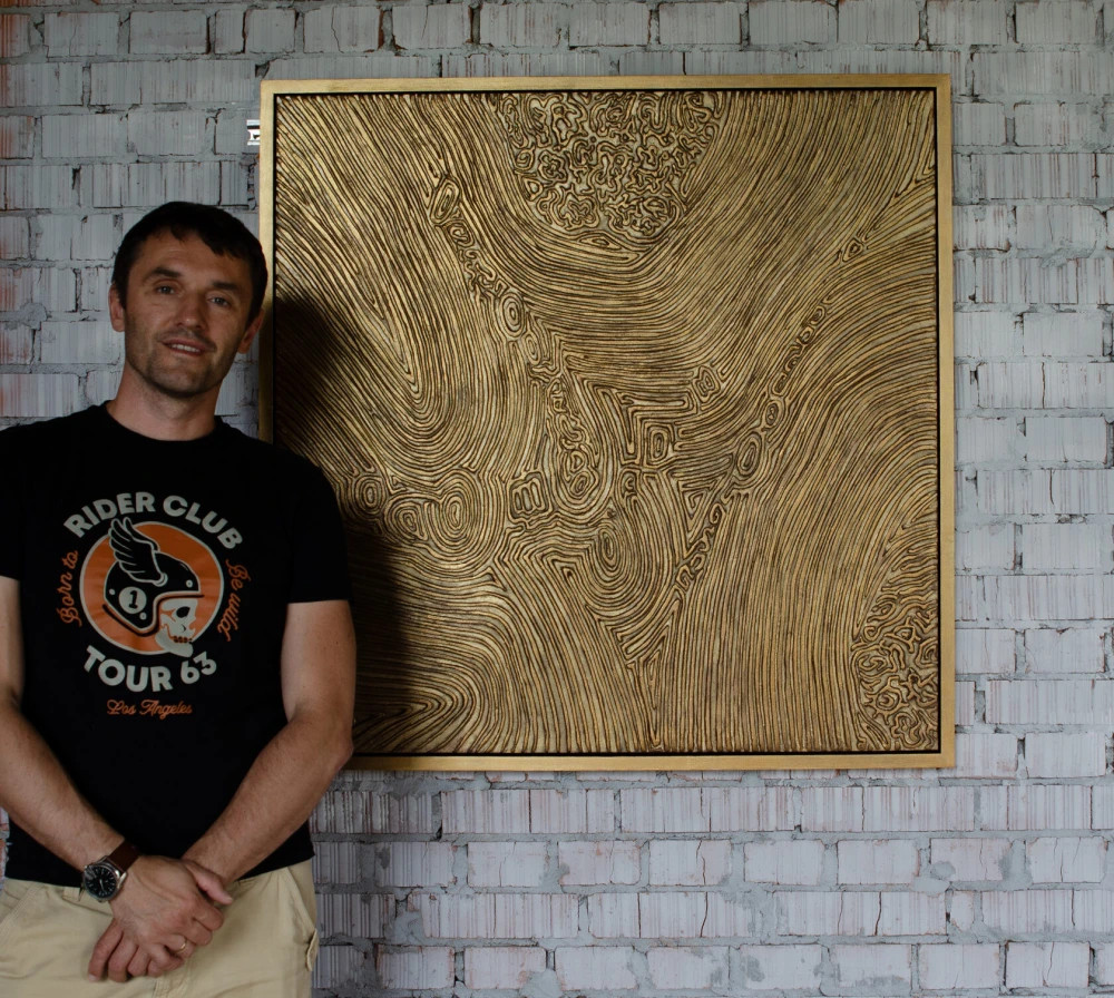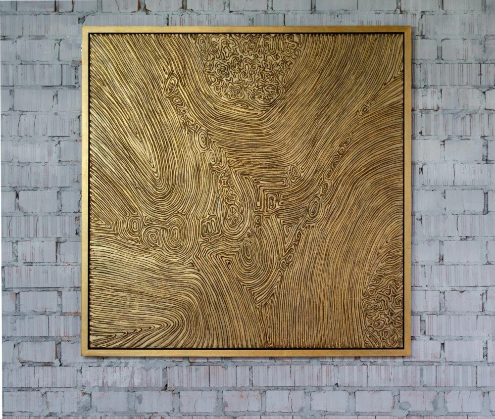 Рельефная роспись золотом наполнена динамикой и светом. Золотистые линии и формы, изгибаясь, создают ощущение движения, как будто поверхность "дышит". Цвет золота меняется в зависимости от освещения, добавляя глубины. Картина абстрактна, что оставляет простор для интерпретации