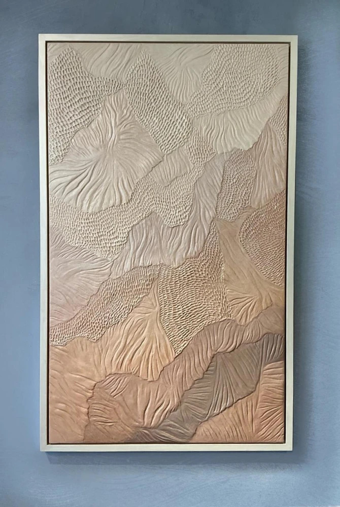 Рельефная композиция словно вылеплена из самого света и тени. Мягкие линии и текстуры перекликаются друг с другом, создавая эффект текучести и движения — как будто поверхность то поднимается, то опадает, будто повторяя дыхание природы. Нюдовая гамма с тёплыми переходами раскрывает объём и глубину, а рельеф под разным углом меняет характер: от спокойного до драматичного. Картина абстрактна, оставляя зрителю пространство для собственного прочтения — то ли это пейзаж, то ли кожа земли, то ли внутренний ландшафт.