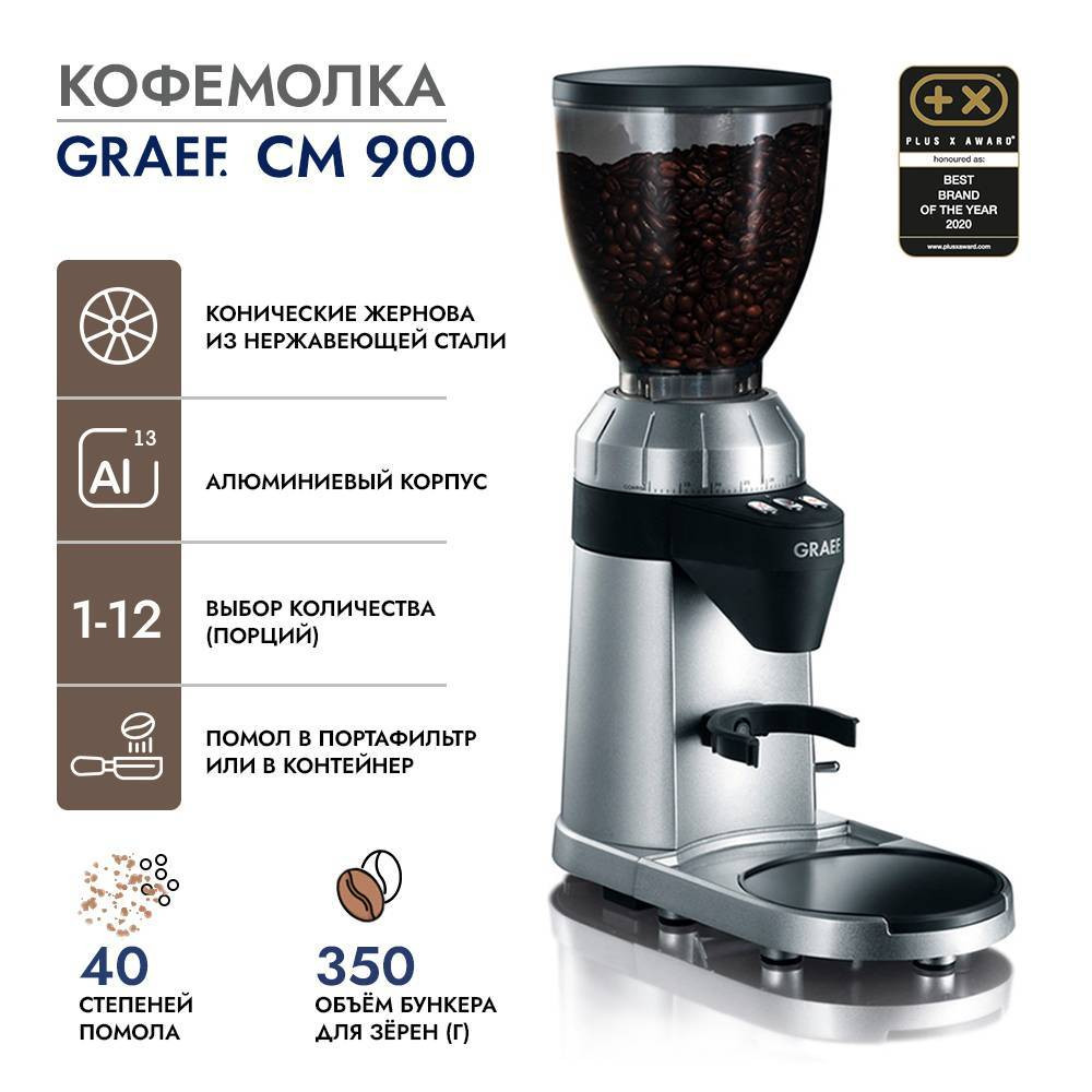Алюминиевый корпус серебристого цветаКонические жернова из нержавеющей сталиДвигатель с низкими оборотами для сохранения аромата40 степеней помолаПомол сразу в портафильтр или в контейнерМарка: GRAEFМодель: CM 900Страна марки: ГерманияСтрана производства: КитайГарантийный срок: 2 годаМатериал корпуса: АлюминийКонические жернова: ДаОбъём бункера для зёрен (г): 350Выбор степени помола (ступеней): 40Выбор количества (порций): 1-12Напряжение (В): 230Мощность (Вт): 128Масса, нетто (кг): 2.71