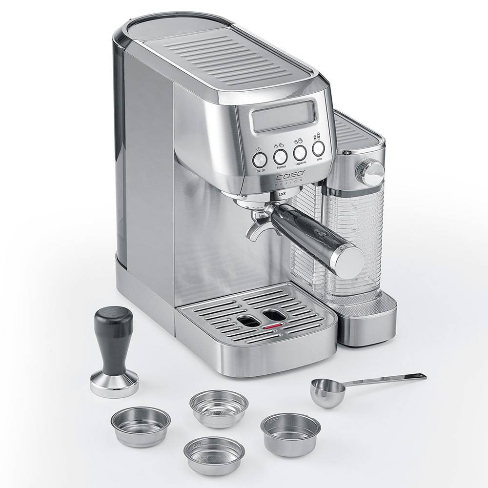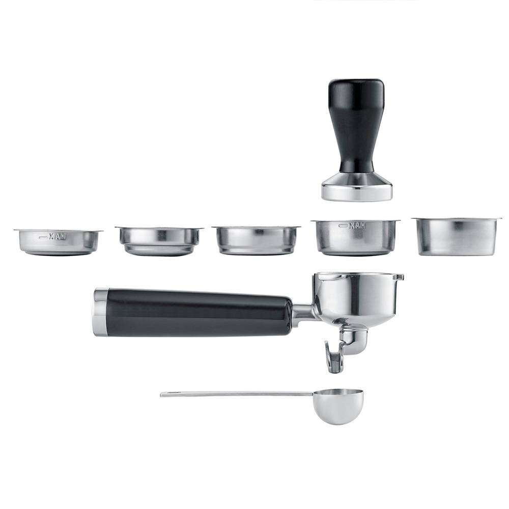 В комплекте: ложка из нержавеющей стали и прочный металлический тампер с деревянной ручкой, две двухстенные и две одностенные корзины портафильтра из нержавеющей стали на 1 и 2 чашки, корзина фильтра, насадки ESE, портафильтр из нержавеющей стали