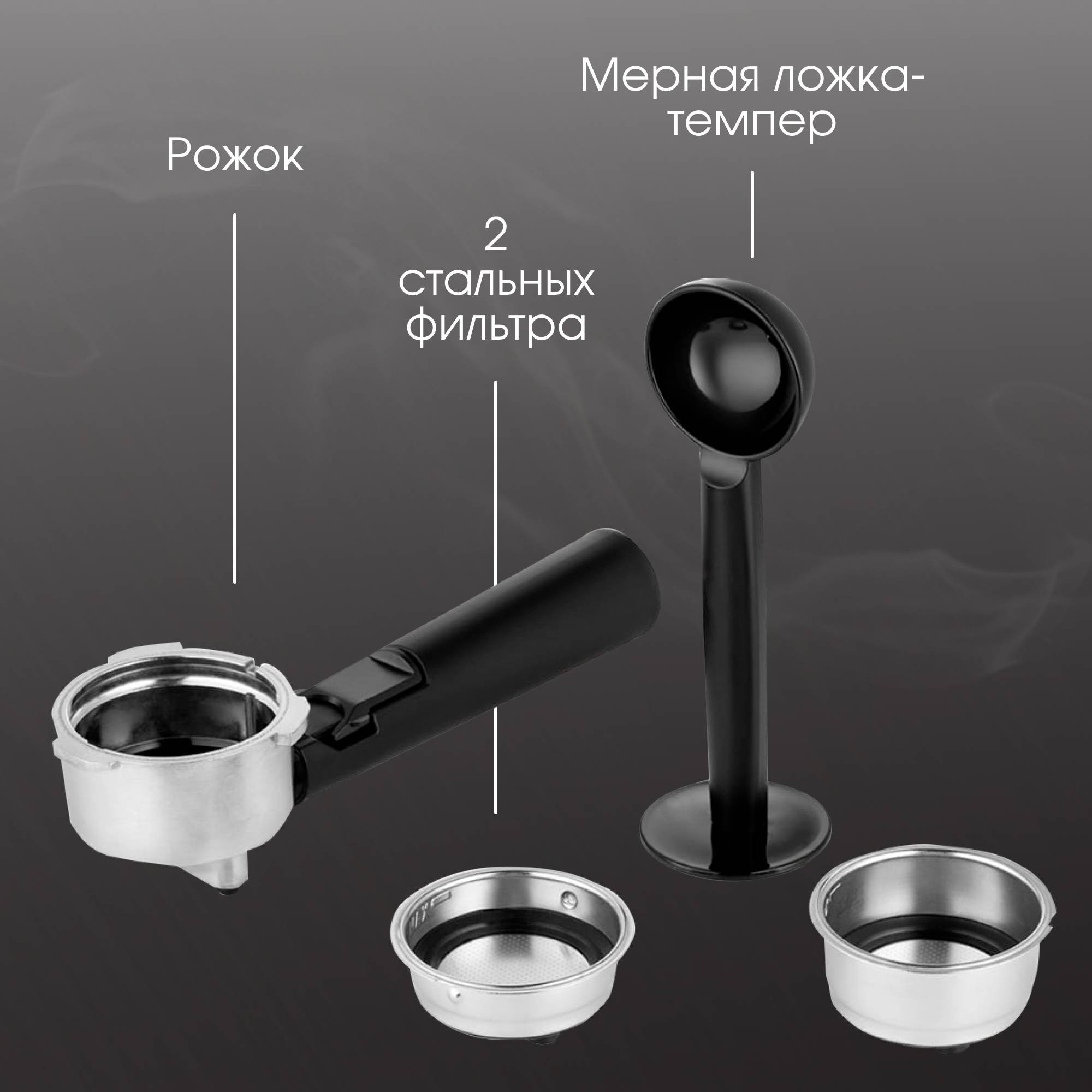 Комплектация: кофеварка, фильтр стальной для рожка 2 шт, мерная ложка-темпер, инструкция с рецептами, гарантийный талон
