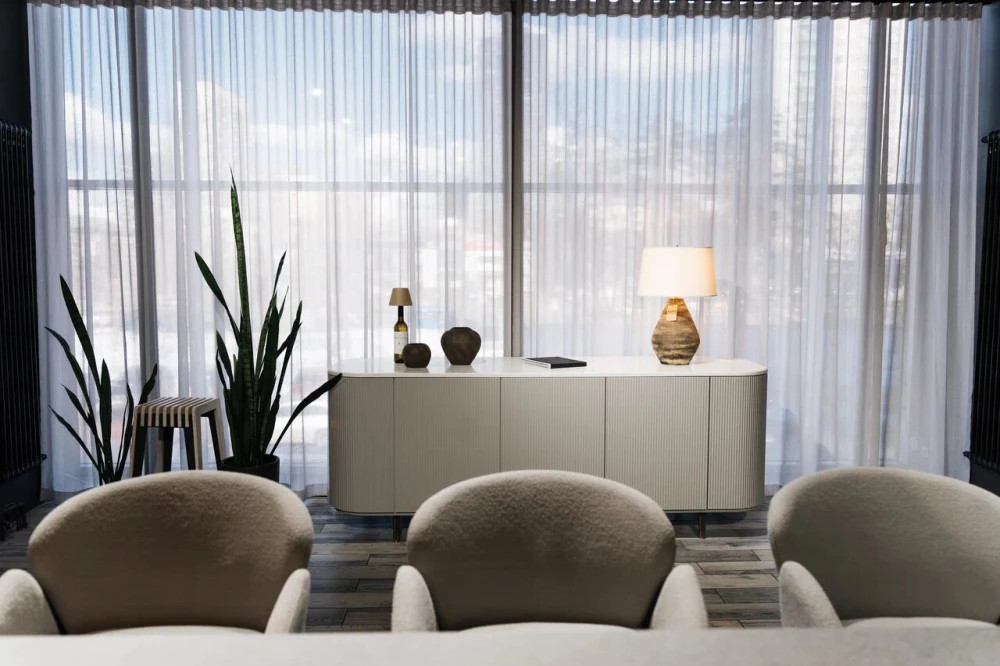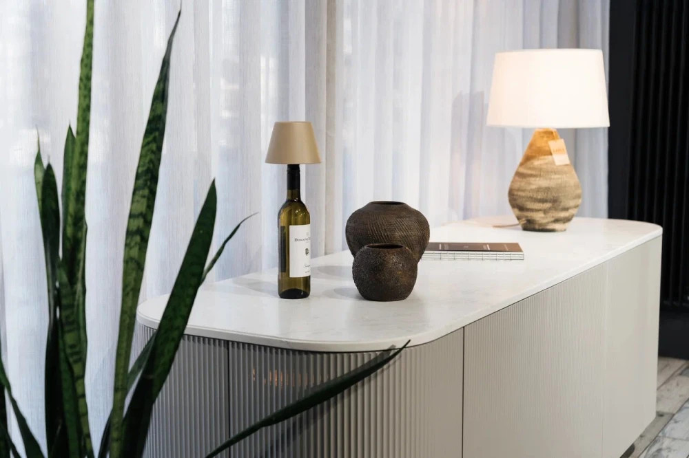 За счет комбинирования кварцевой столешницы и каннелированных фасадов, покрытых высококачественной глянцевой эмалью получилася утончённая и элегантная композиция.