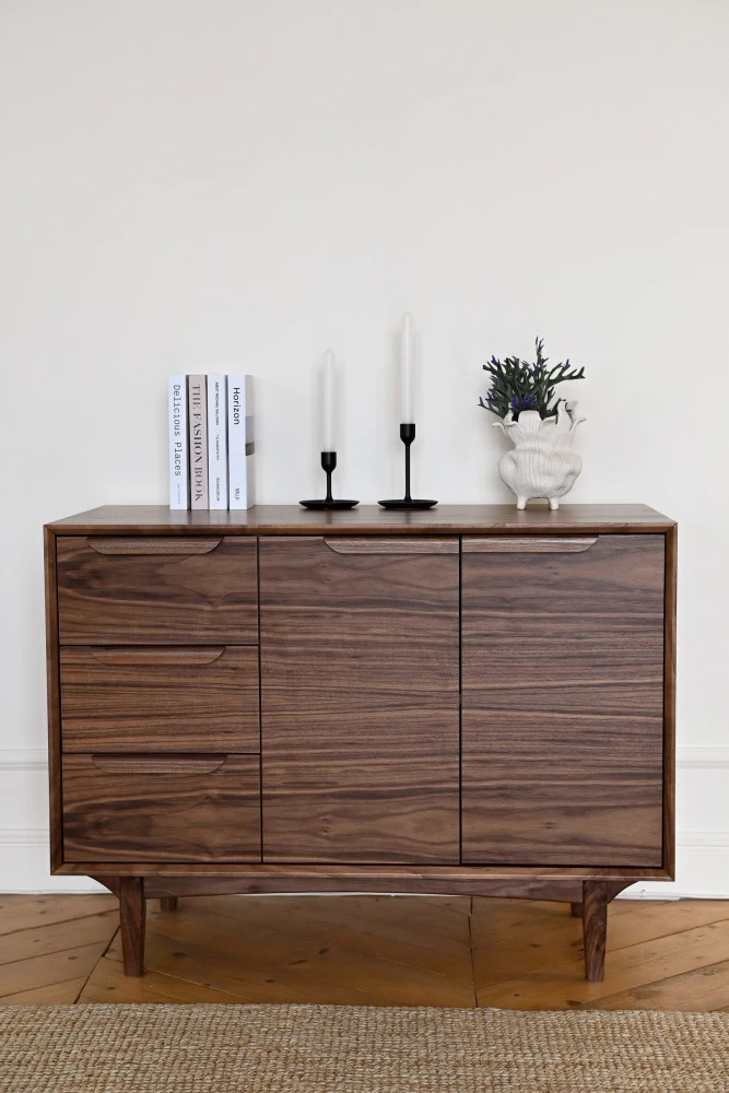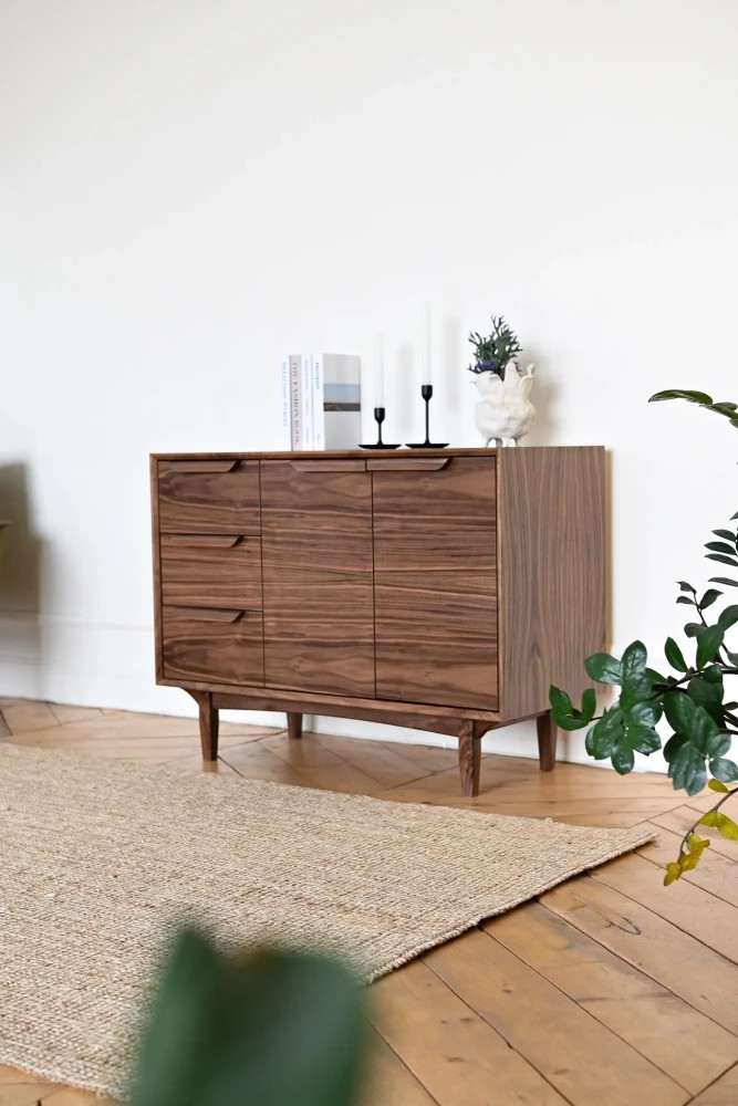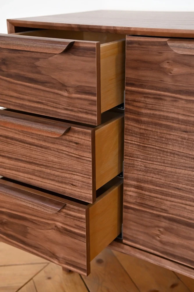 Классическая mid-century креденза из ореха с красивым рисунком, своей конструкцией напоминает знаменитые «буфеты из Мартинсвилля».