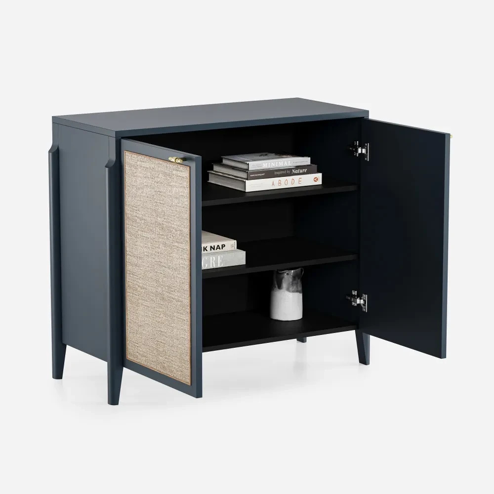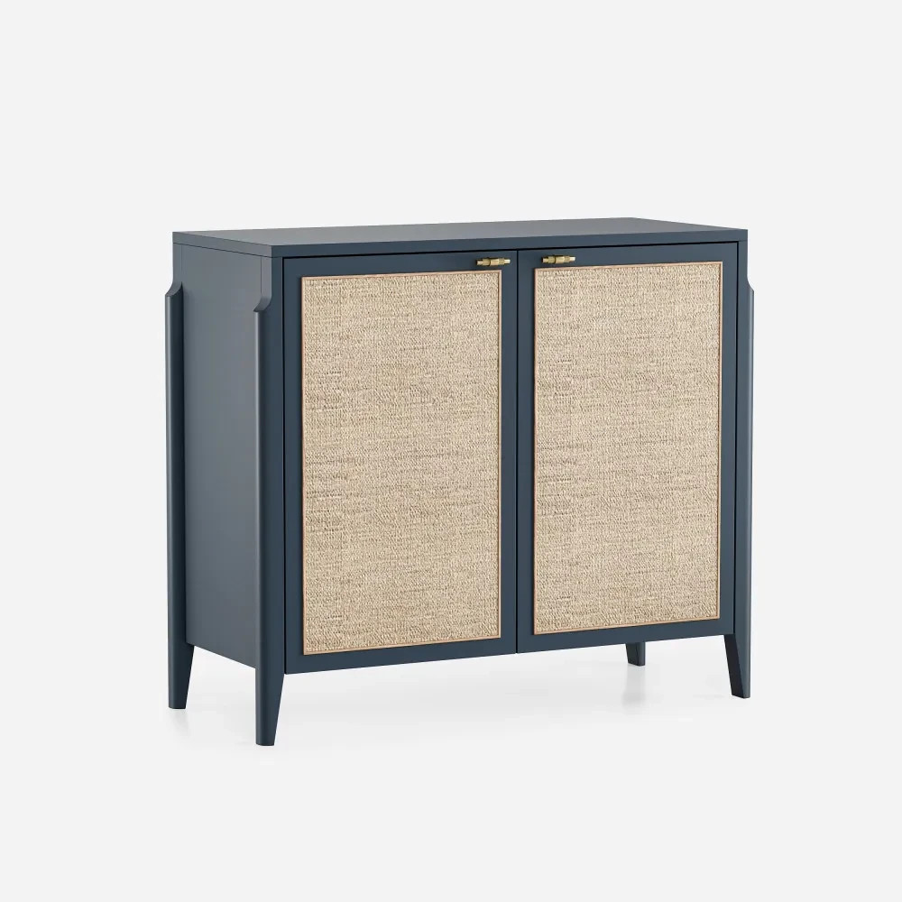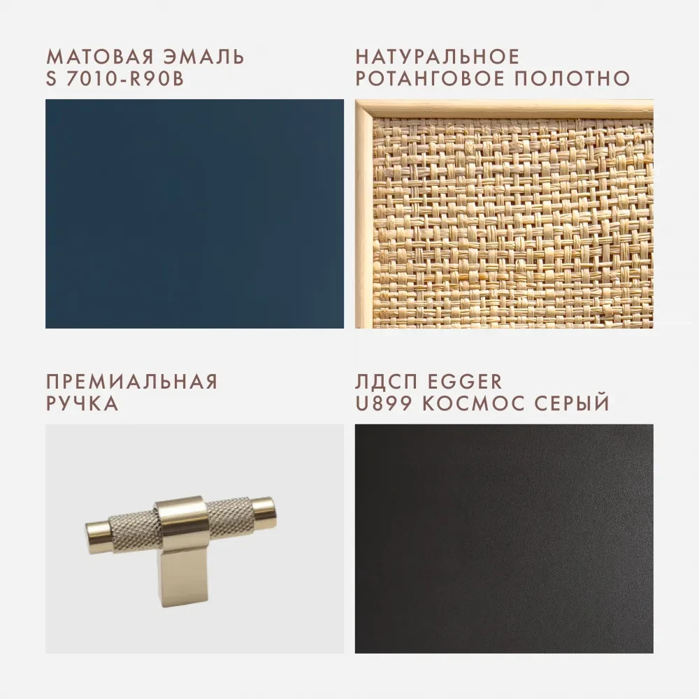 Комод с ротангом Vishera синего цвета выполнен из МДФ, покрытого матовой итальянской эмалью. В основе дизайна коллекции – оригинальный фасадный декор, выполненный из натурального ротангового полотна.