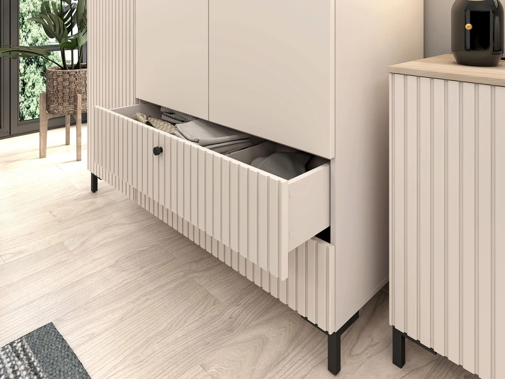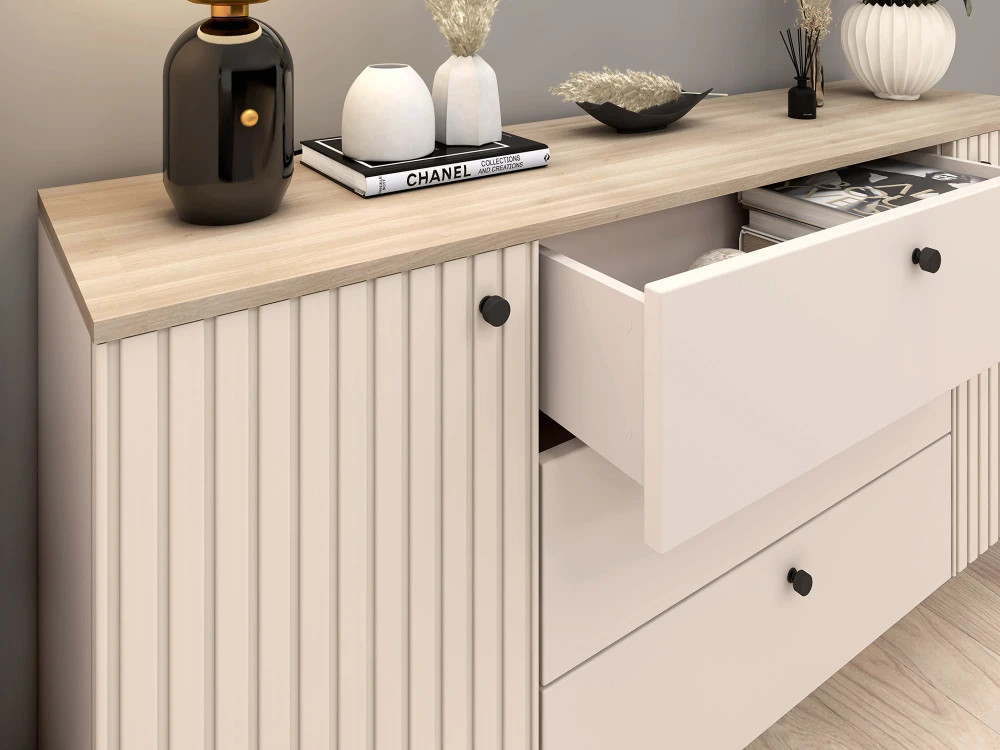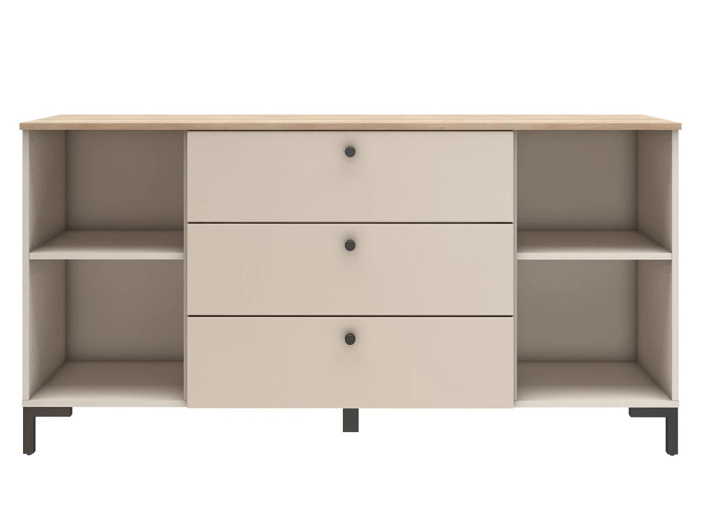 Комод оснащён вместительными выдвижными ящиками на плавных направляющих, что обеспечивает лёгкое и бесшумное открывание. Дополняют образ чёрные металлические ручки и пластиковые опоры в тон.