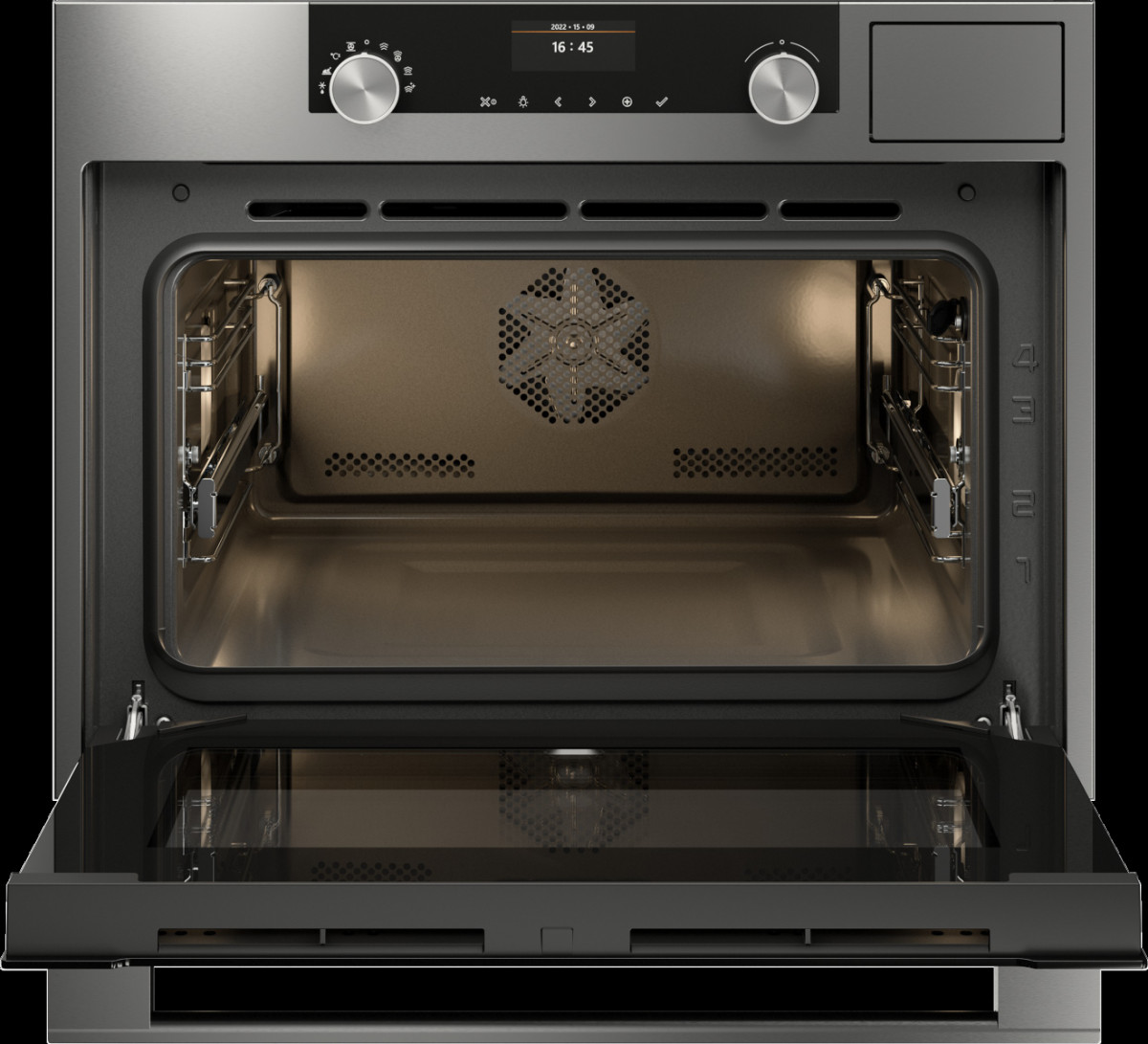 Прибор управляется при помощи цветного LED-дисплея и двух программаторов Jog Dial. Они интуитивно понятны и делают навигацию проще. Безопасность обеспечивает четверное остекление дверцы UltraCoolDoorQuadro+. Благодаря этому поверхность практически не нагревается, а тепло остаётся внутри. Используя очистку AquaClean можно легко удалить жир и грязь. Горячий пар в течение 30 минут с регулярными интервалами подаётся в камеру из-за чего отложения на стенках размягчаются и удаляются с помощью тряпки.