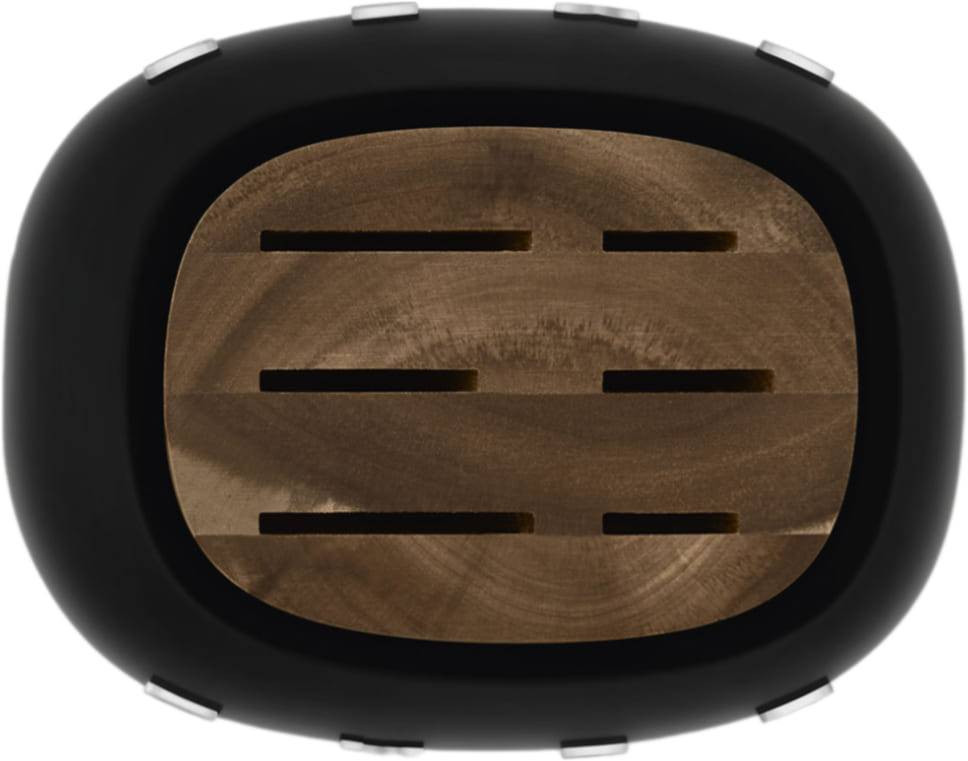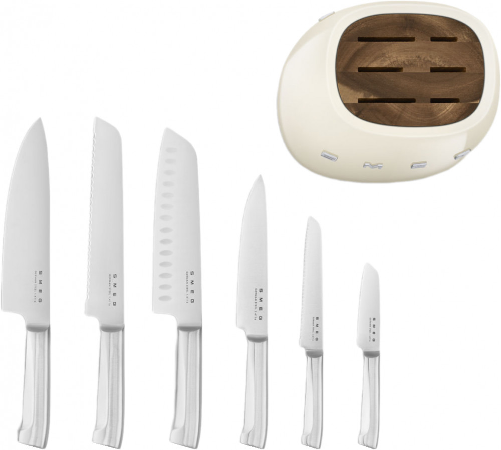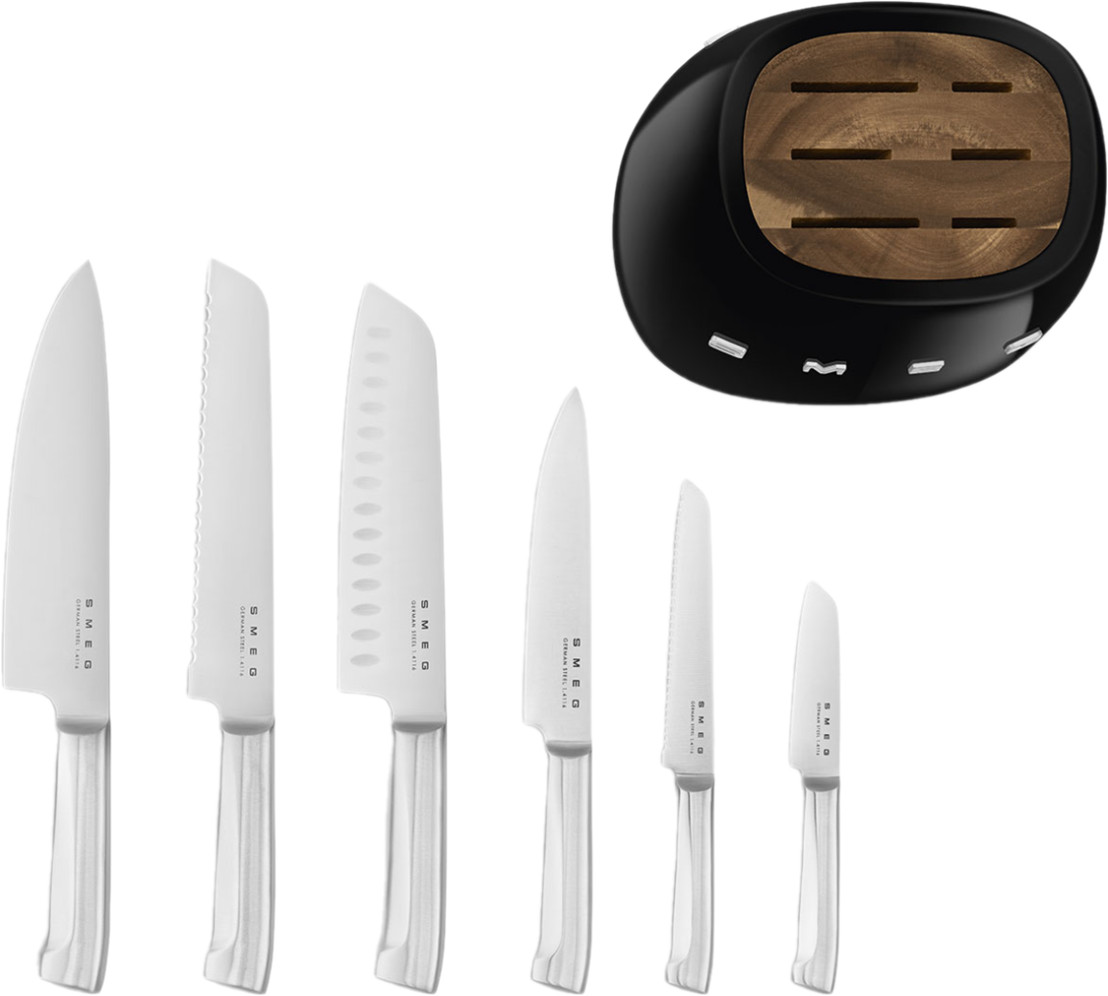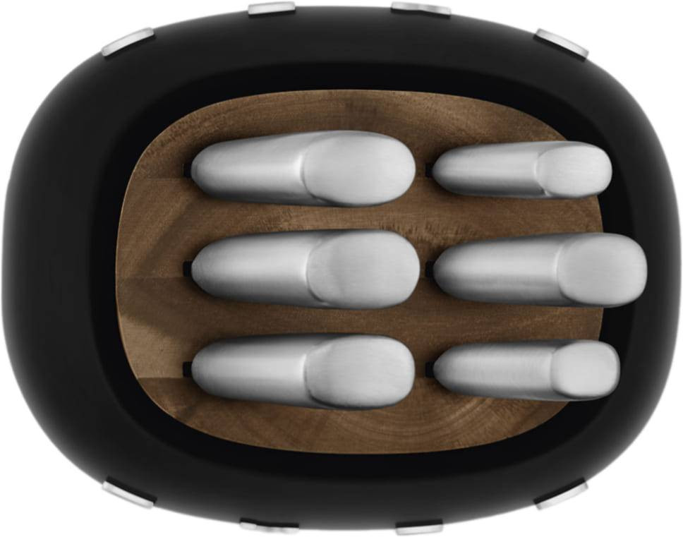 Комплект включает ножи, изготовленные из высококачественной нержавеющей стали немецкого сплава, что гарантирует долговечность и устойчивость к коррозии. Пазы для ножей выполнены из дерева акации, что добавляет набору утончённости и природного тепла. Прочный корпус и основание из глянцевого пластика с хромированной отделкой подчеркивают премиальный вид набора.