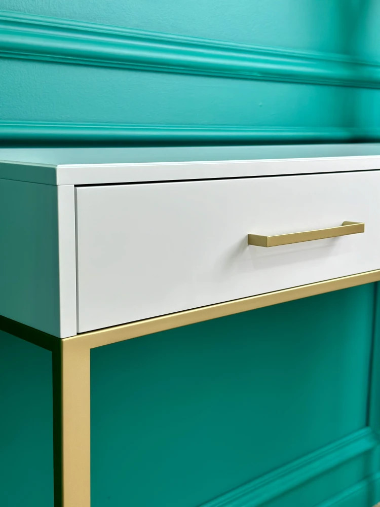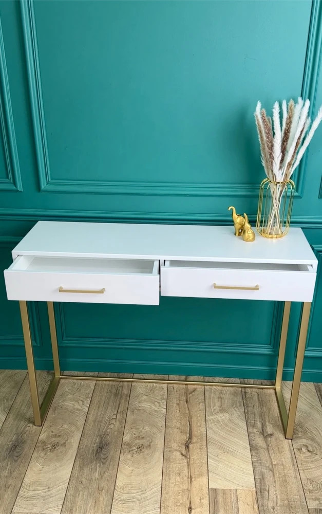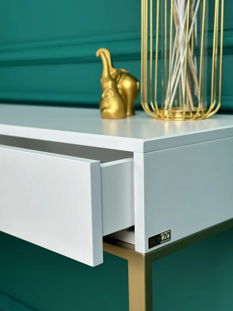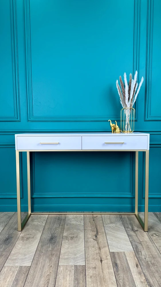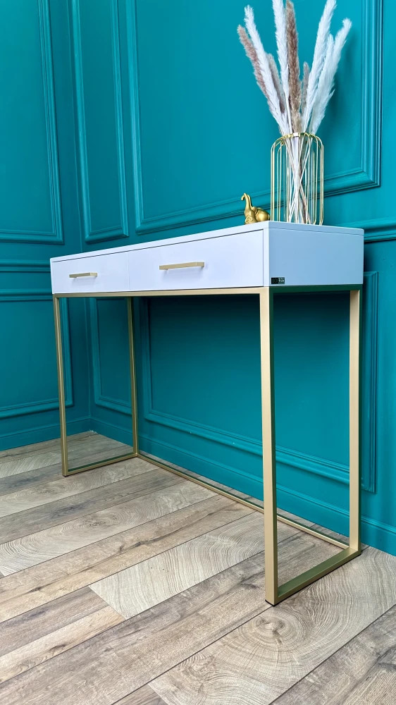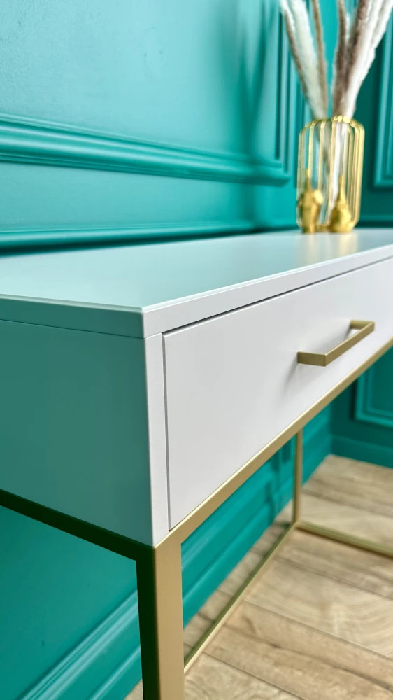 Интерьерная консоль с выразительным основанием в современном геометричном стиле. Подходит для прихожей, спальни или зоны макияжа. Эффектное сочетание цвета корпуса и металла делает модель ярким акцентом в любом интерьере.