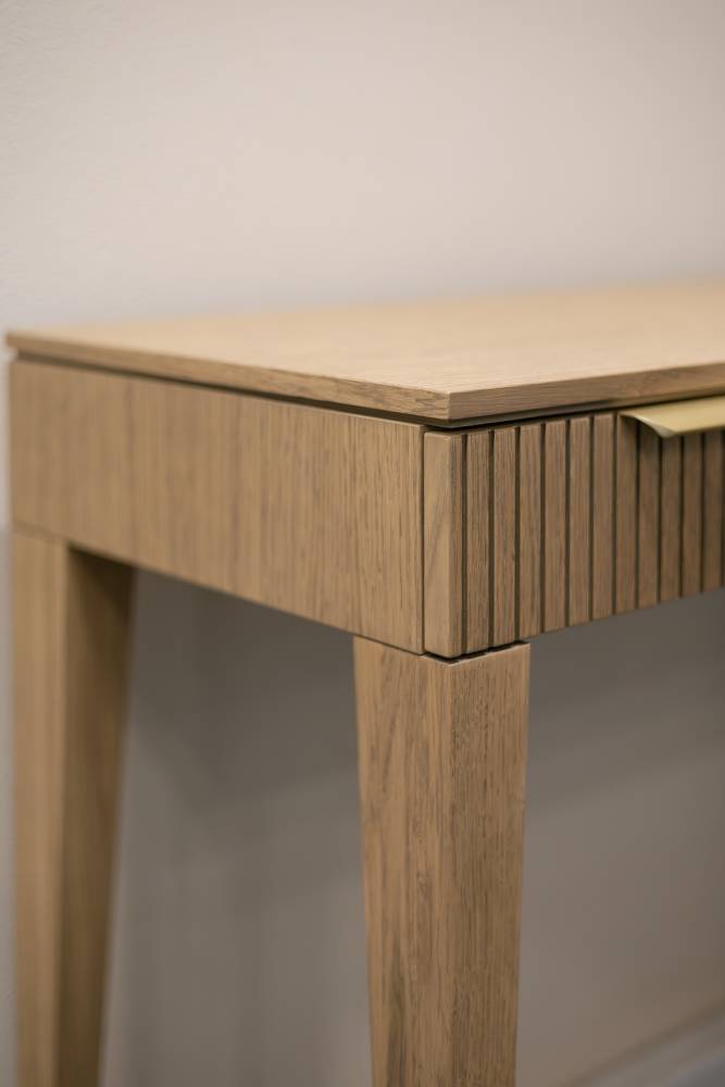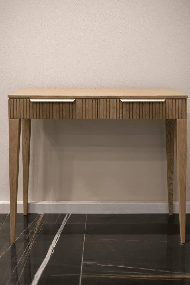 Консоль— это идеальное сочетание стиля и функциональности. С его современным дизайном и уютной атмосферой она станет прекрасным дополнением как для офиса, так и для дома. Два выдвижных ящика данной модели позволят удобно хранить все необходимые мелочи и документы. Ручки под латунь добавляют изысканности и стильности этому элементу мебели, придают ему особый элегантный вид. Ножки из массива дуба обеспечивают прочную и надежную основу, при этом придавая ему природный и натуральный вид. Эта консоль станет не только практичным элементом в вашем интерьере, но и стильным декоративным акцентом, подчеркивающим ваш индивидуальный вкус и предпочтения.