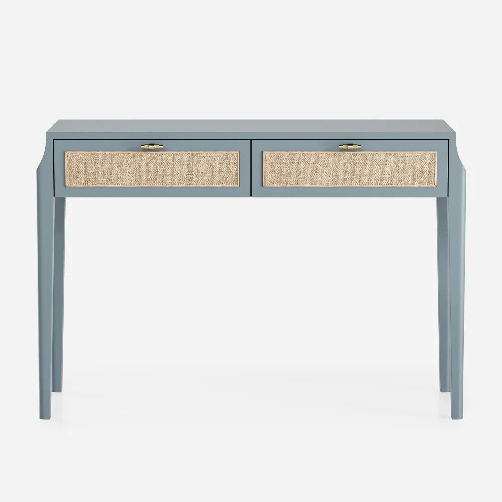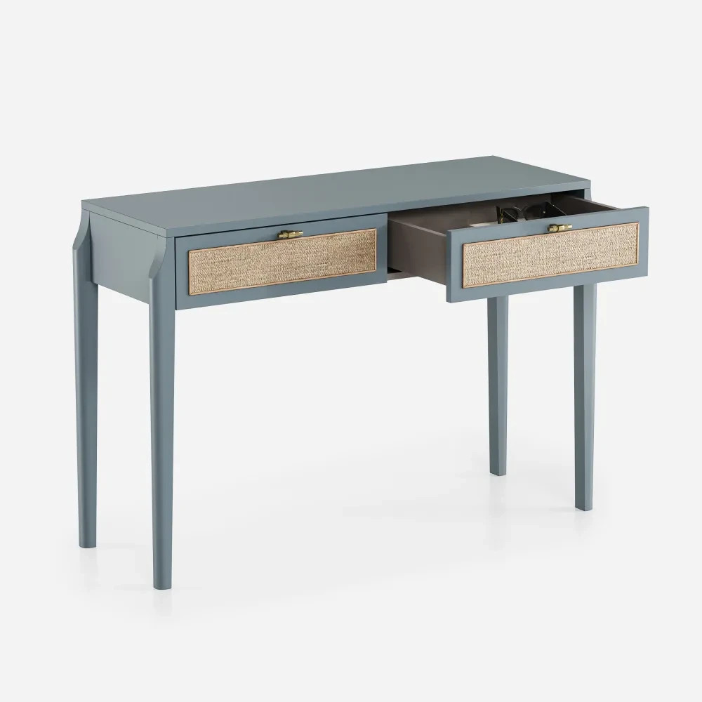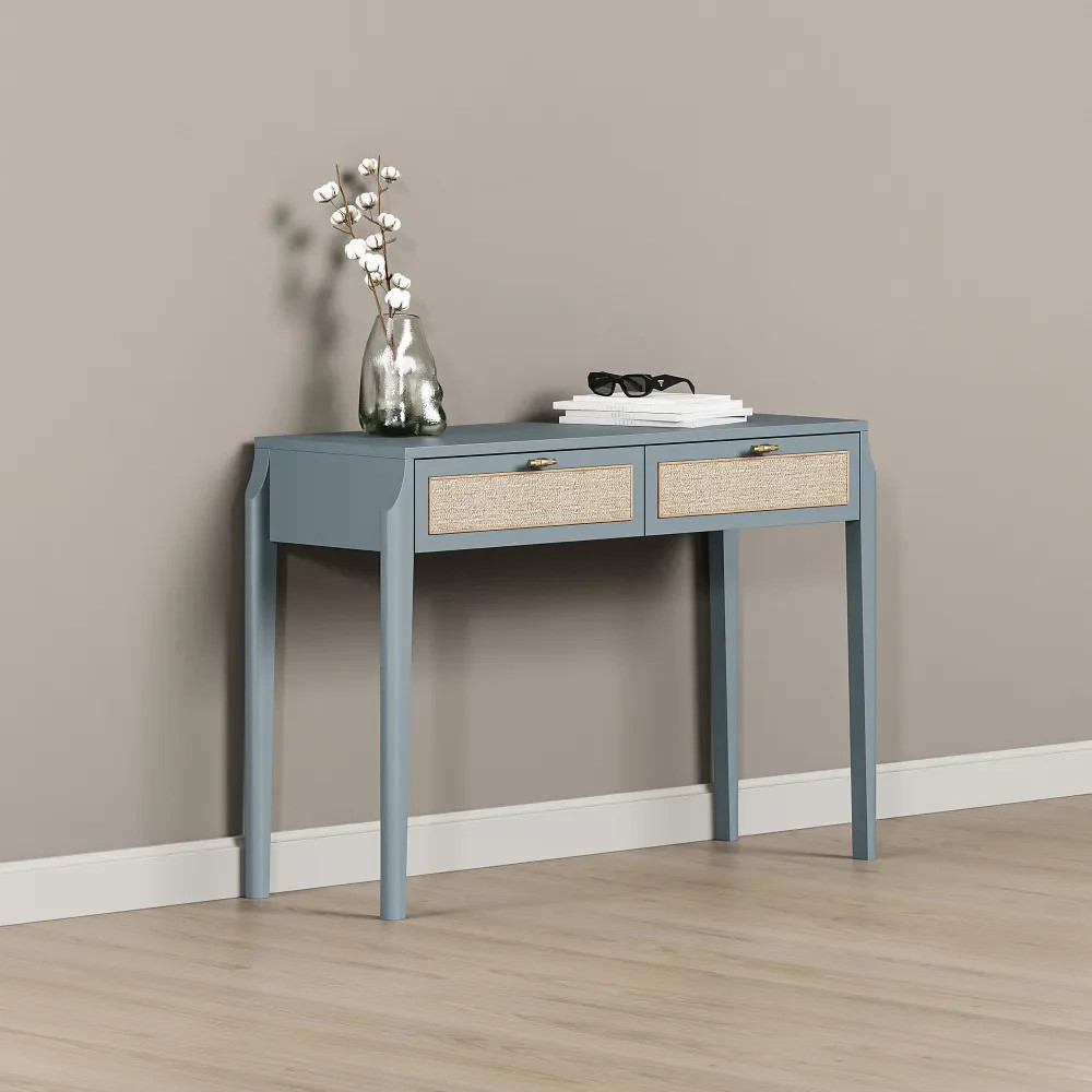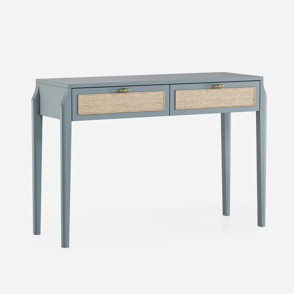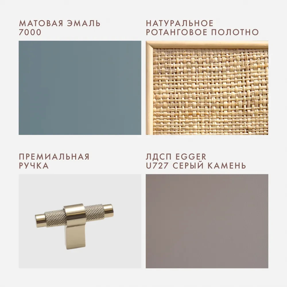 Консоль подвесная с ротангом tioTeo Vishera морского цвета выполнена из МДФ, покрытого матовой итальянской эмалью. В основе дизайна коллекции – оригинальный фасадный декор, выполненный из натурального ротангового полотна.