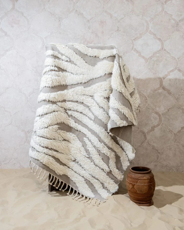 Ковер Beni N9 — мягкий и завораживающий. Высокий ворс из натуральной шерсти сплетен вручную индийскими мастерами, создавая ощущение уюта и глубины. Бежевая основа и белые нити органично переплетаются в рисунок, навеянный марокканской эстетикой — он словно отражает движение песка и рельефы пустыни Сахара.