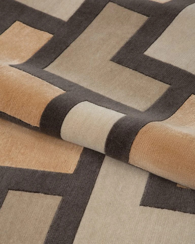 Ковер Esken мгновенно привлекает внимание своим геометричным узором и выразительным «вырезанным» краем. Динамичный рисунок из пересекающихся форм создаёт эффект движения, а мягкая природная палитра — песочные, кремовые и бежевые оттенки — придаёт ковру сдержанную элегантность. Это эффектный акцент для интерьера, где ценят баланс между формой и содержанием.
