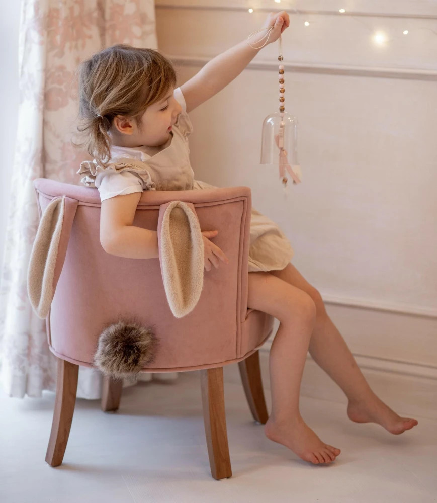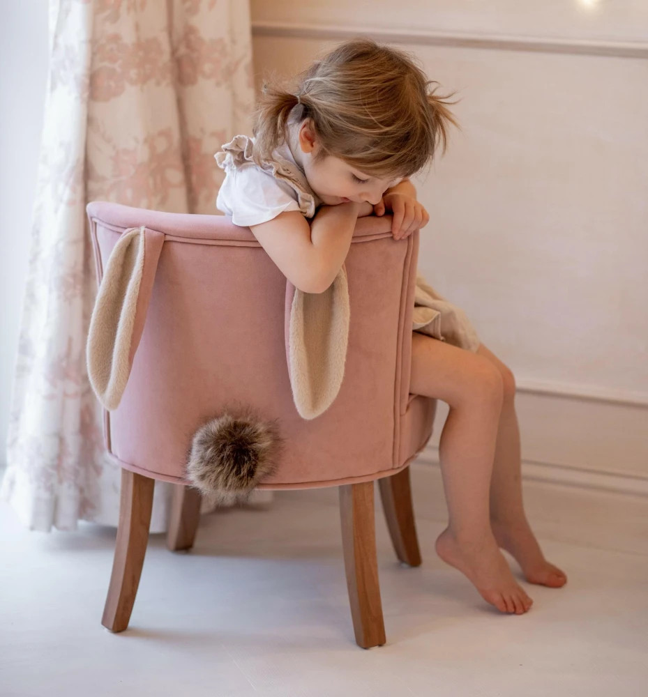 Кресло Amari модель Зайка в пыльно розовом велюре и меховыми ушками иск. норка. Эта невероятно красивая модель кресла преобразит Ваш интерьер. Кресло средней высоты к столу высотой 50-55 см.