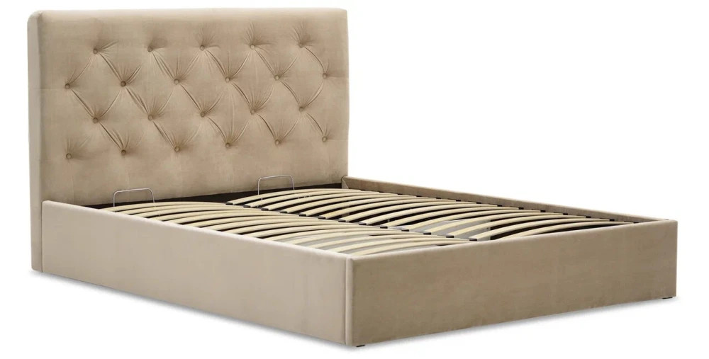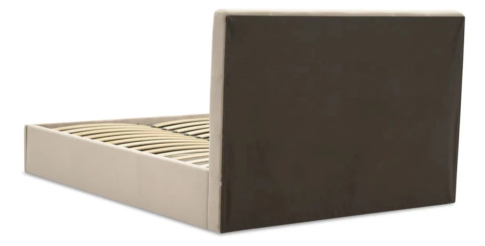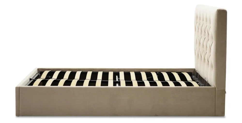 Кровать оснащена надежным и долговечным металлическим основанием с ортопедическими латами для правильного положения во время сна.