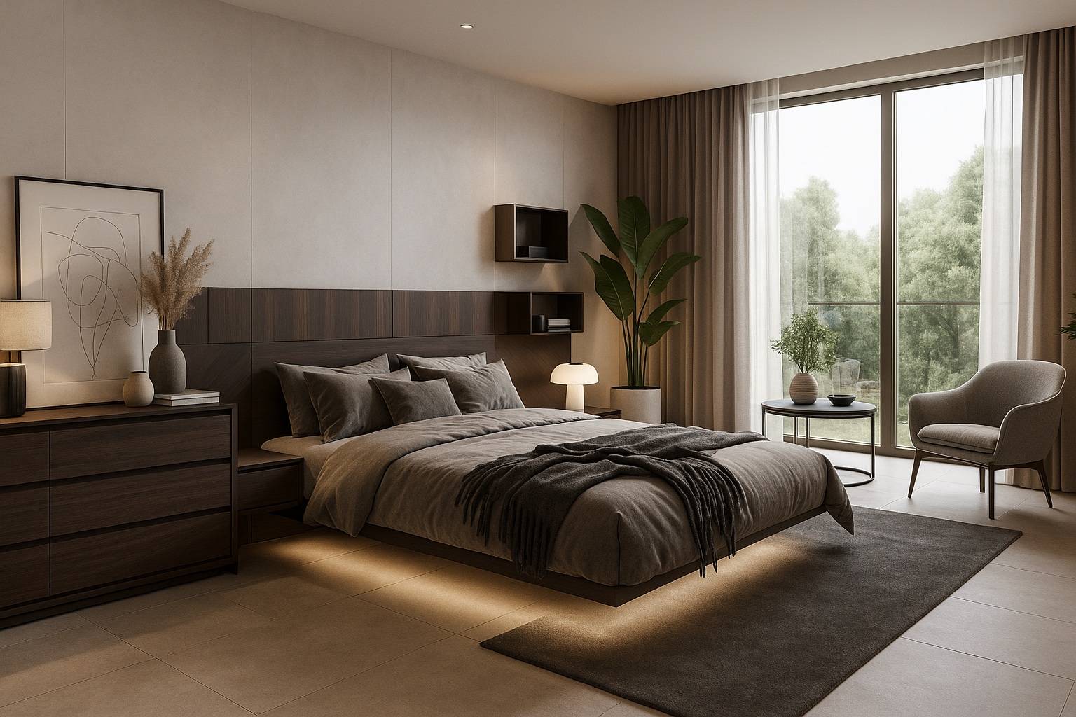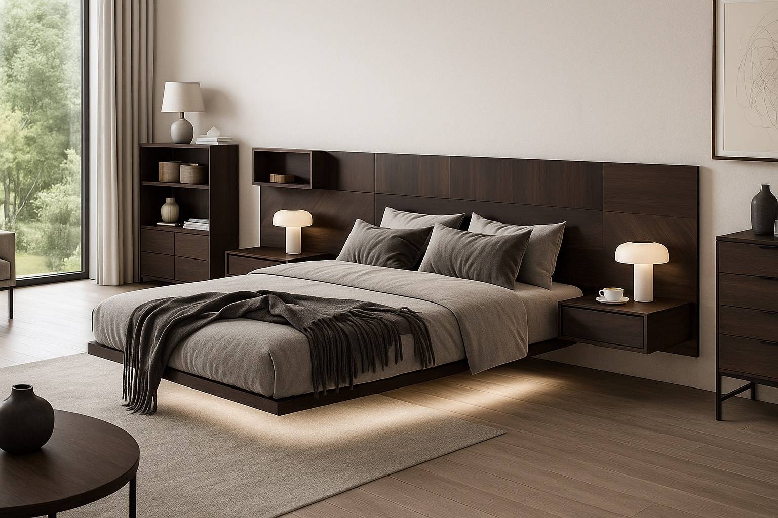 Футуризм без пафоса — кровать dcomP806 будто парит над полом благодаря встроенной подсветке, создающей эффект левитации. Гармония геометрии и текстуры подчёркнута спокойной цветовой гаммой, которая идеально сочетается с интерьером в стиле минимализм или японский дзен.