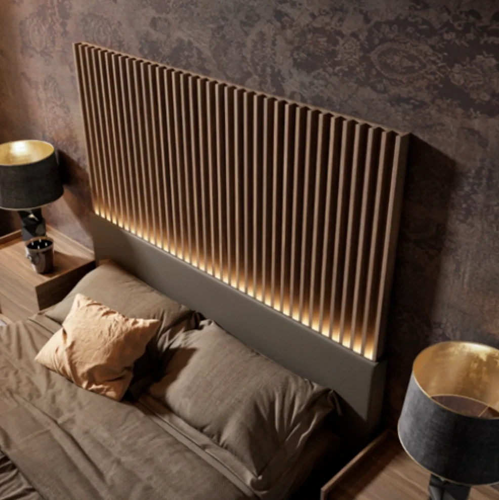Тактильная теплота дерева, архитектурная строгость линий и эффектный световой акцент — кровать dcomp812 создана для интерьеров, где важны детали. Выразительное изголовье из вертикальных ламелей с интегрированной подсветкой превращает стену в арт-объект и придаёт комнате ощущение глубины и ритма.