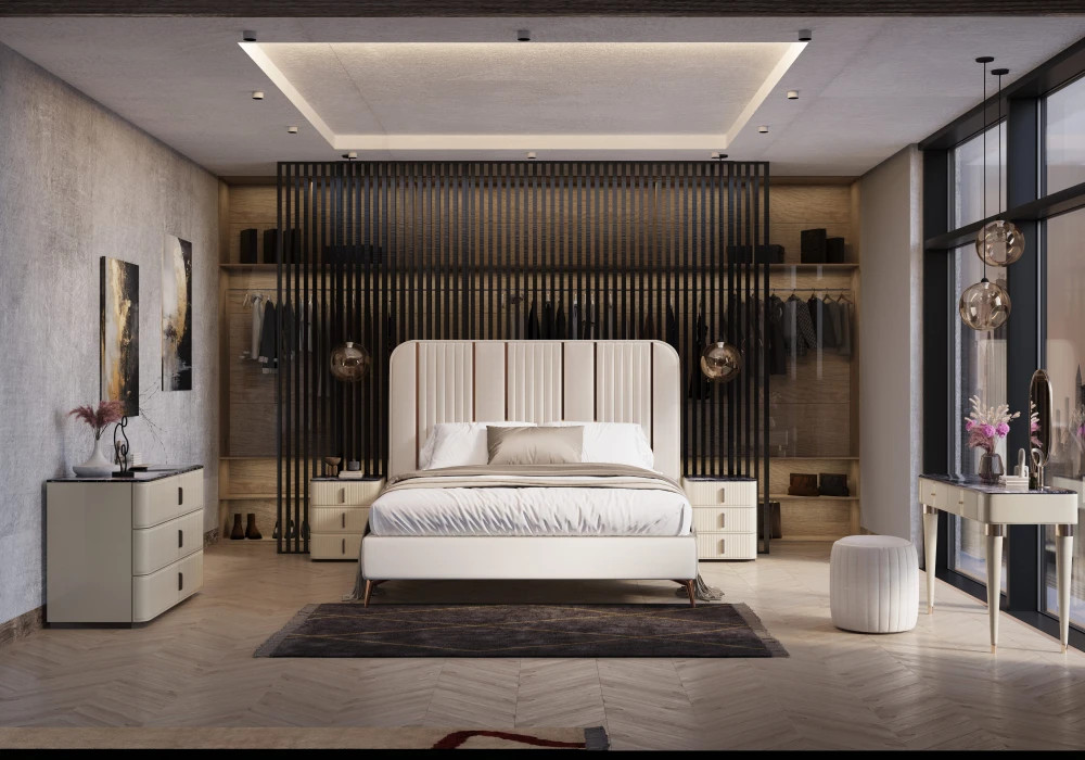 Кровать HOLLYWOOD — это образец выразительного дизайна с нотками арт-деко. Высокое изголовье с вертикальной прострочкой напоминает интерьер дорогих бутик-отелей и задаёт тон всей спальне. Обивка из кожи или замши на выбор создаёт тактильное и визуальное удовольствие, а массивная конструкция подчёркивает статус модели.