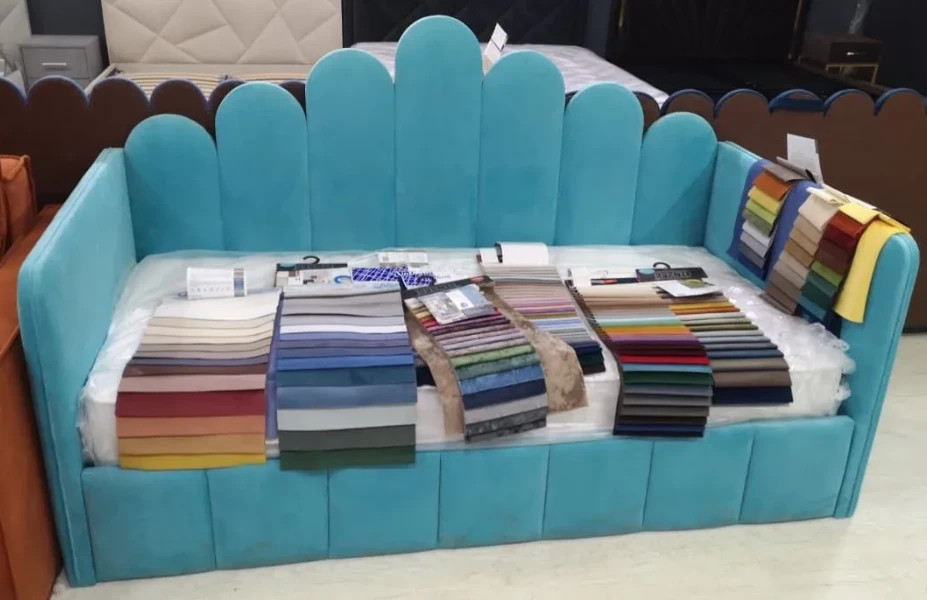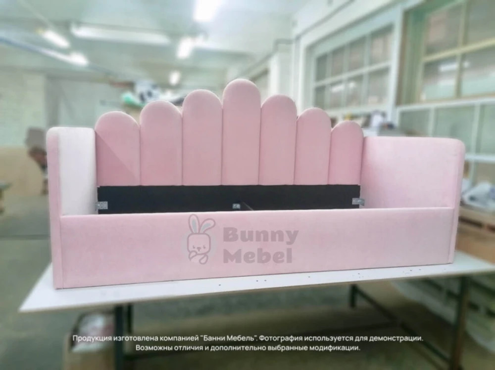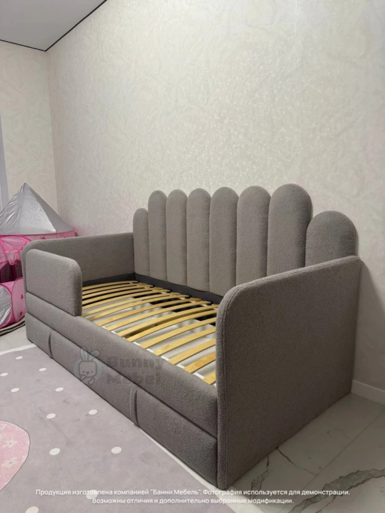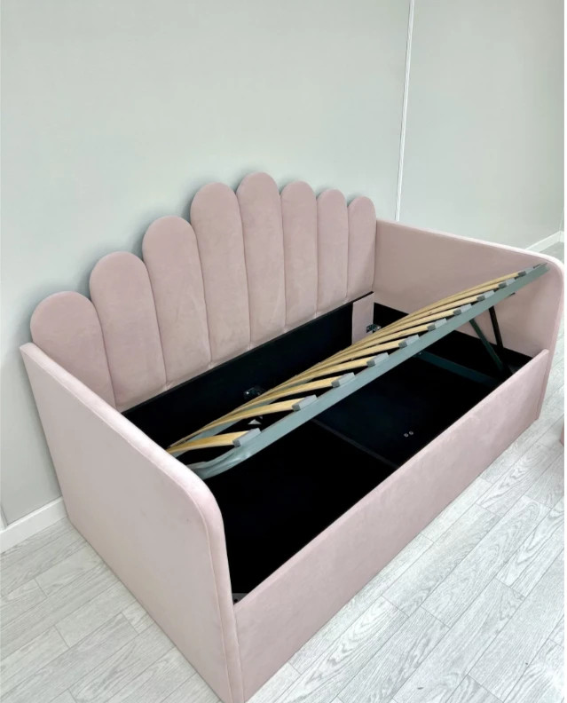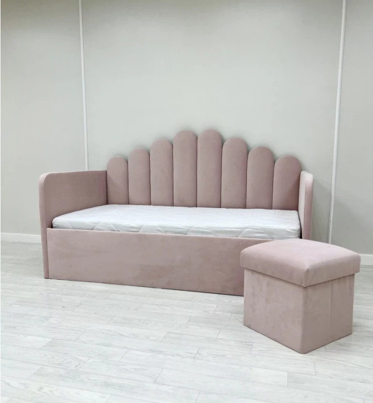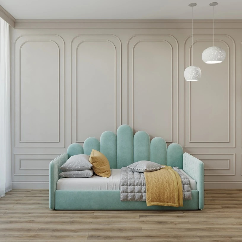 Уютная стильная кровать-софа с оригинальной спинкой и мягкими боковыми бортами