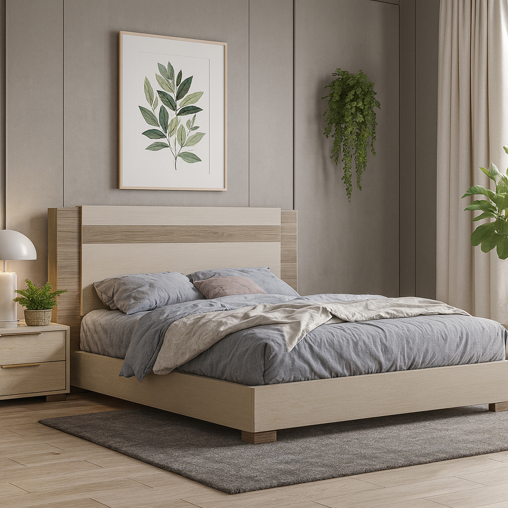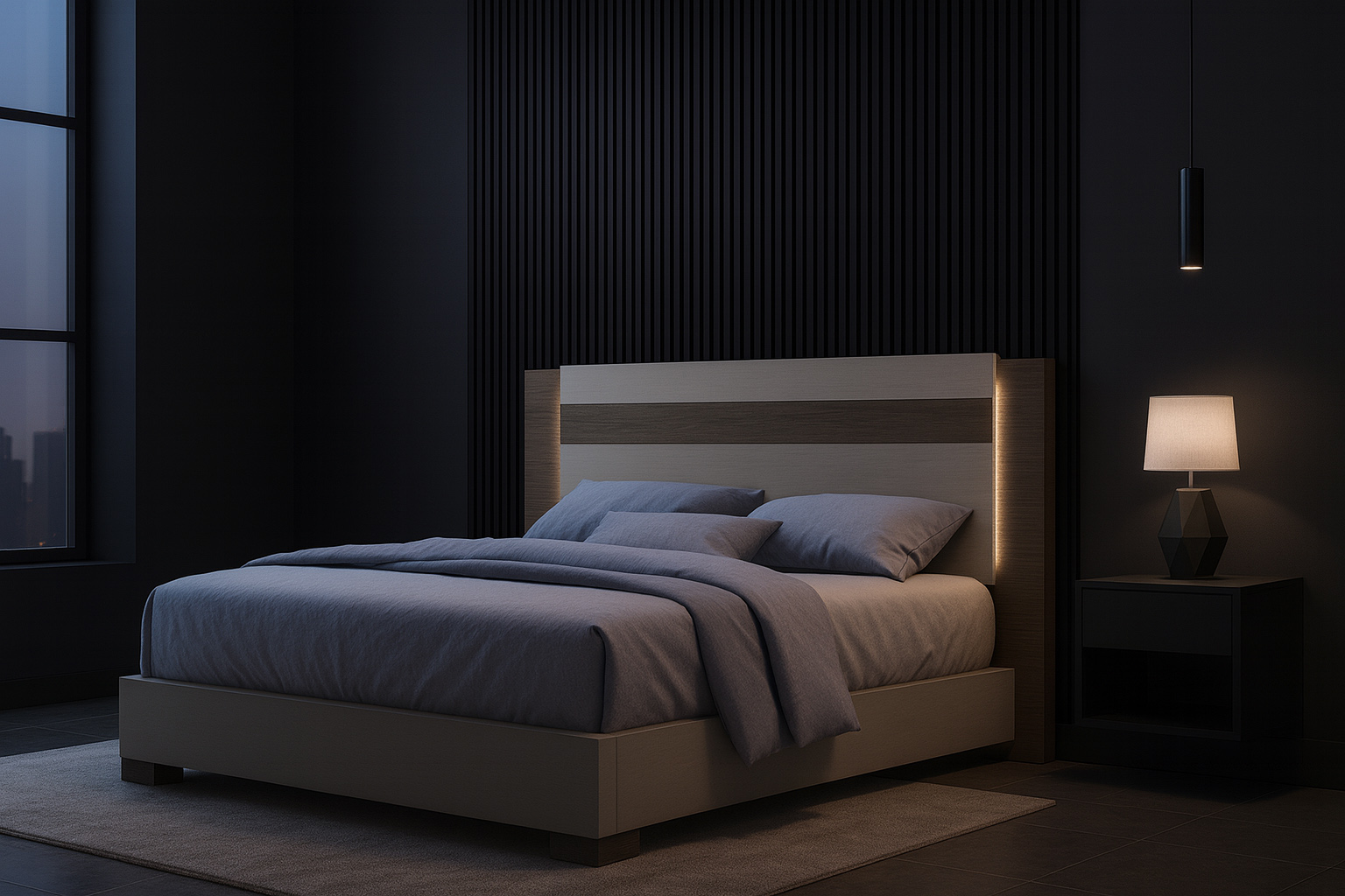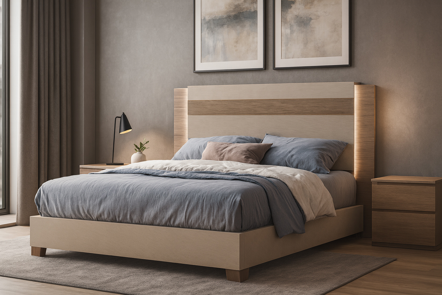 Кровать из коллекции Nora со спальным местом 180х200 см. Изголовье имеет встроенную деликатную подсветку.