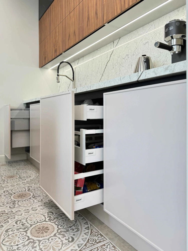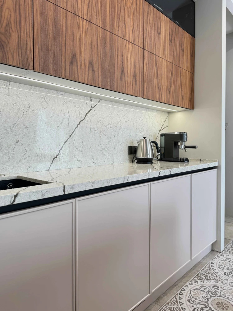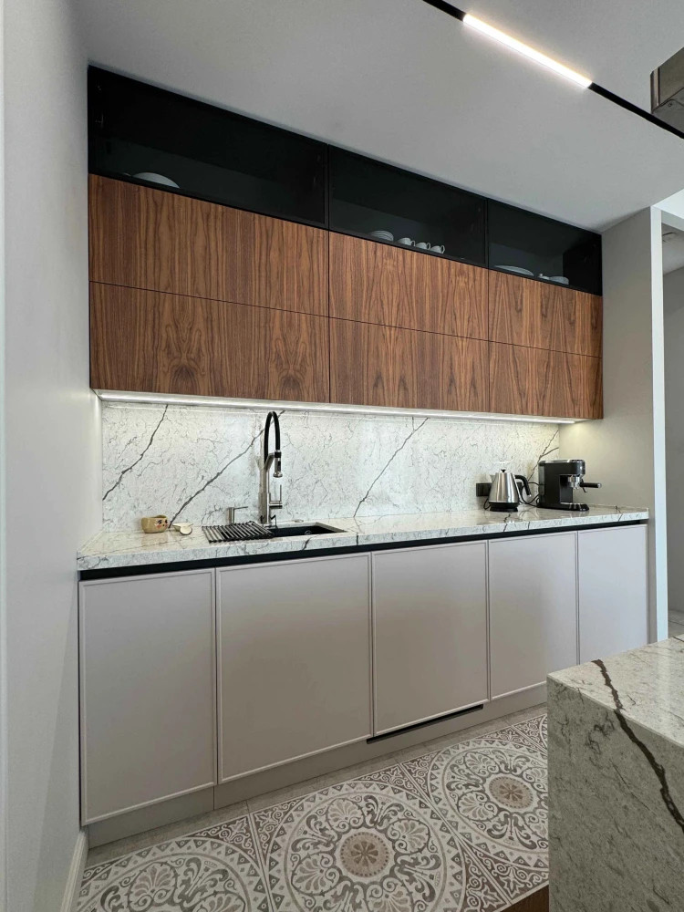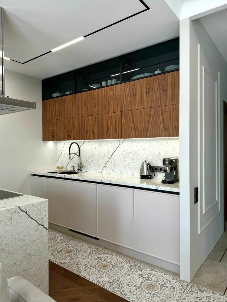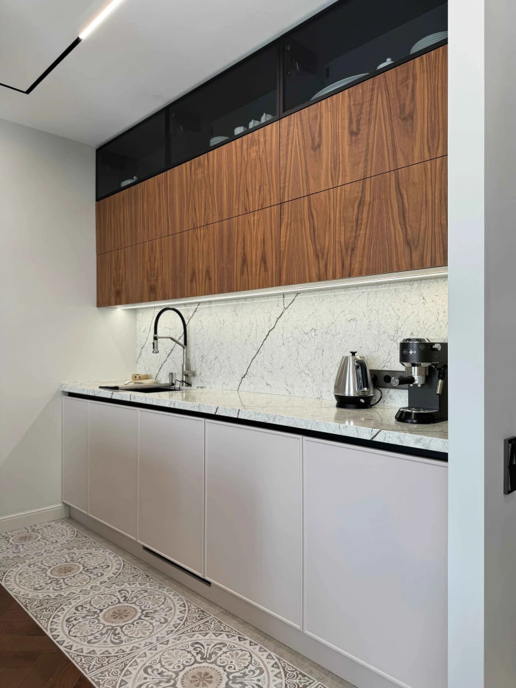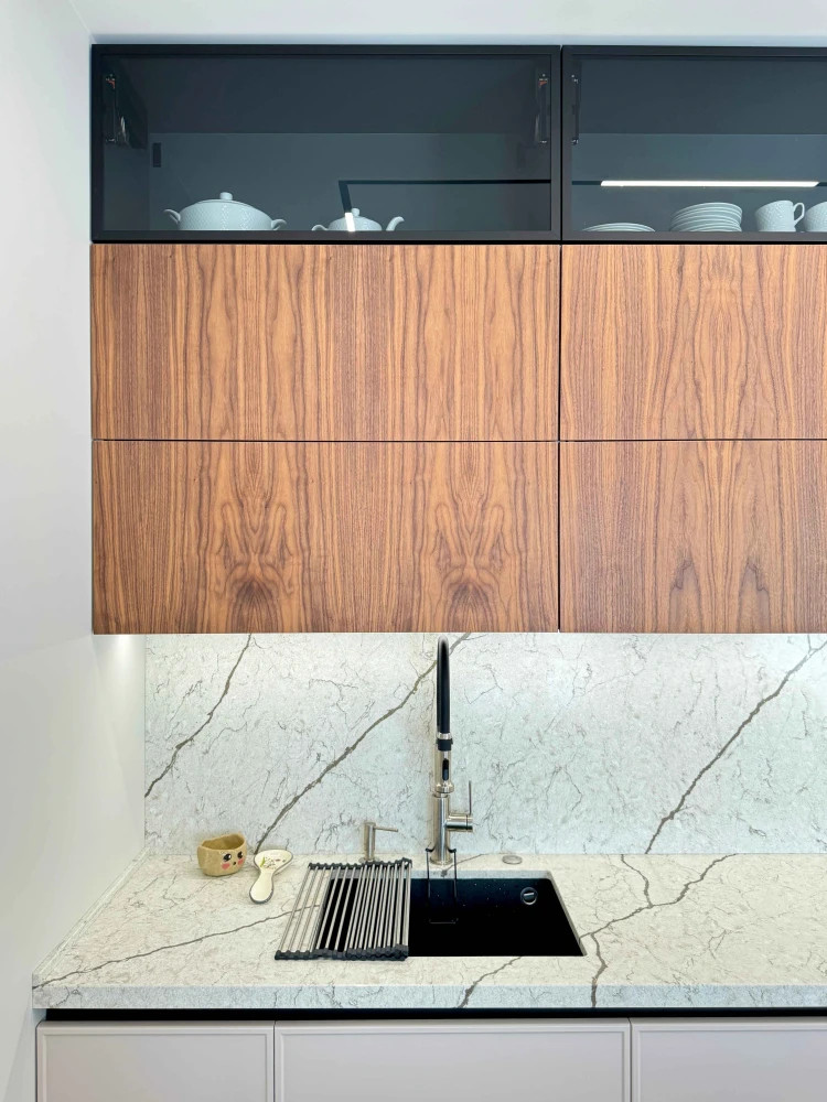 Фасады верхних шкафов выполнены из натурального шпона американского ореха. Он придает интерьеру теплоту и природную текстуру.
