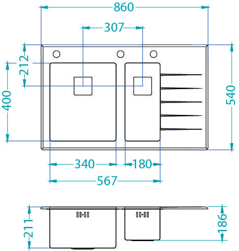 Мойка врезная. Материал Стекло Тип монтажа Над столешницей Форма мойки Одна основная чаша + одна дополнительная с крылом Размер мойки 860 х 540 мм Глубина чаши, мм 200 Ширина шкафа, см 80