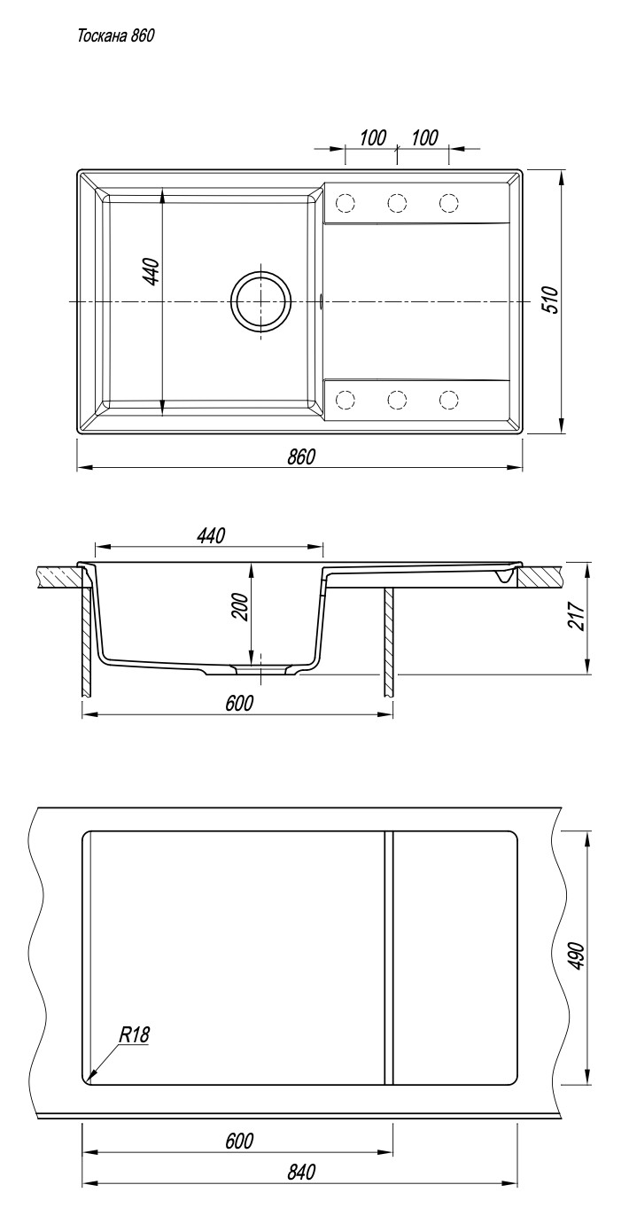 Прямоугольная мойка с большой чашей для кухонного шкафа 60 см