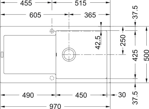 Круглый слив сбоку чаши: продукты и посуда не перекрывают сток воды.
