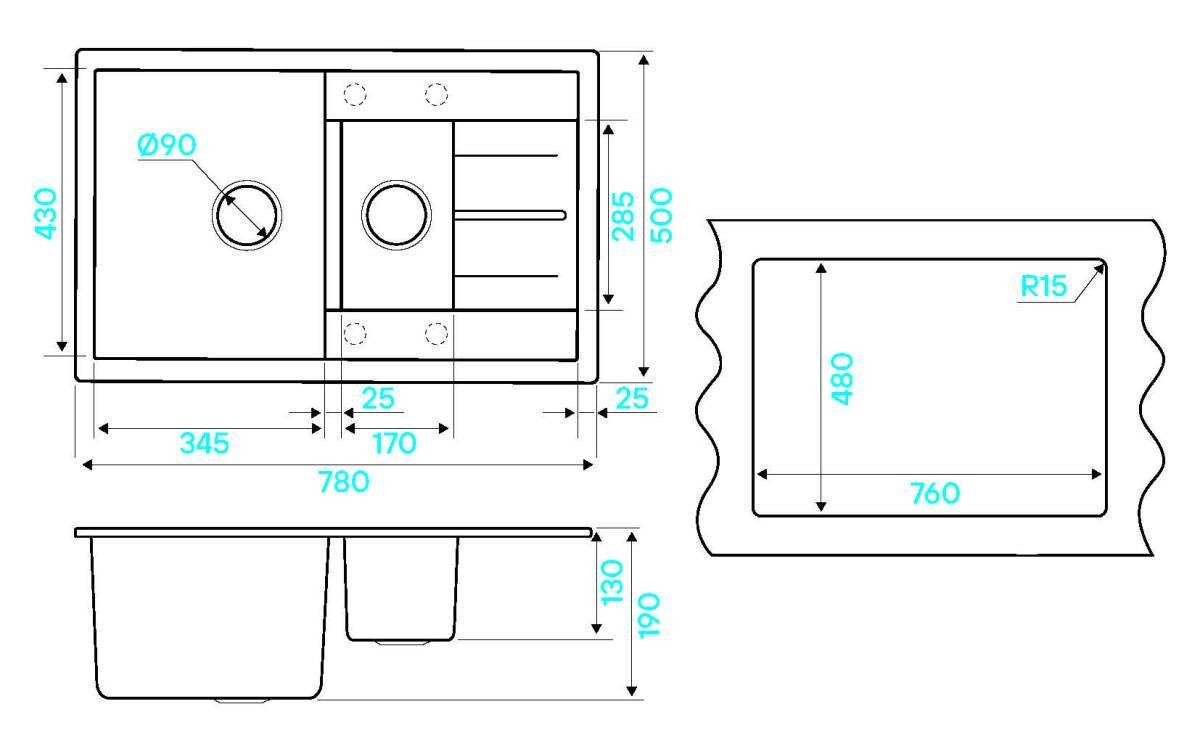 Размер мойки - 780х500х190мм