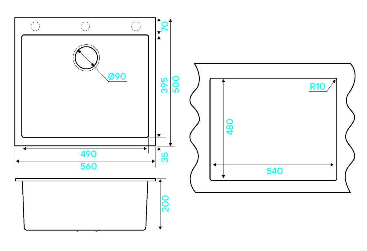 Размер мойки - 560х500х200мм