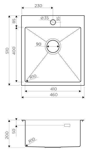Размер выреза под мойку при монтаже под столешницу: 440х490 мм., угловой радиус врезки 10 мм.