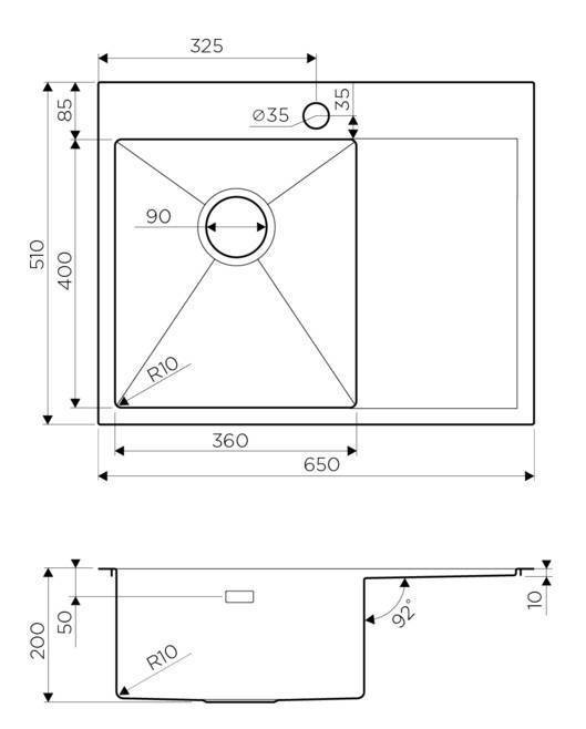 Размер выреза под мойку при монтаже под столешницу: 630х490 мм., угловой радиус врезки 10 мм.