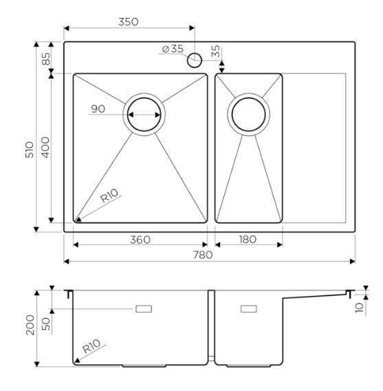 Размер выреза под мойку при монтаже под столешницу: 760х490 мм., угловой радиус врезки 10 мм.