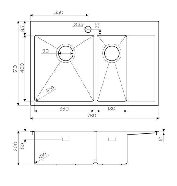 Размер выреза под мойку при монтаже под столешницу: 760х490 мм., угловой радиус врезки 10 мм.