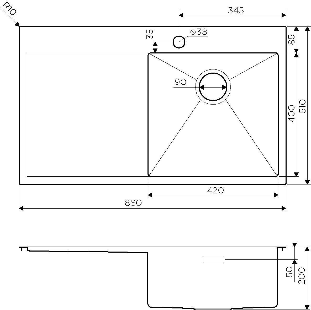Размер выреза под мойку при монтаже под столешницу: 840х490 мм., угловой радиус врезки 10 мм.