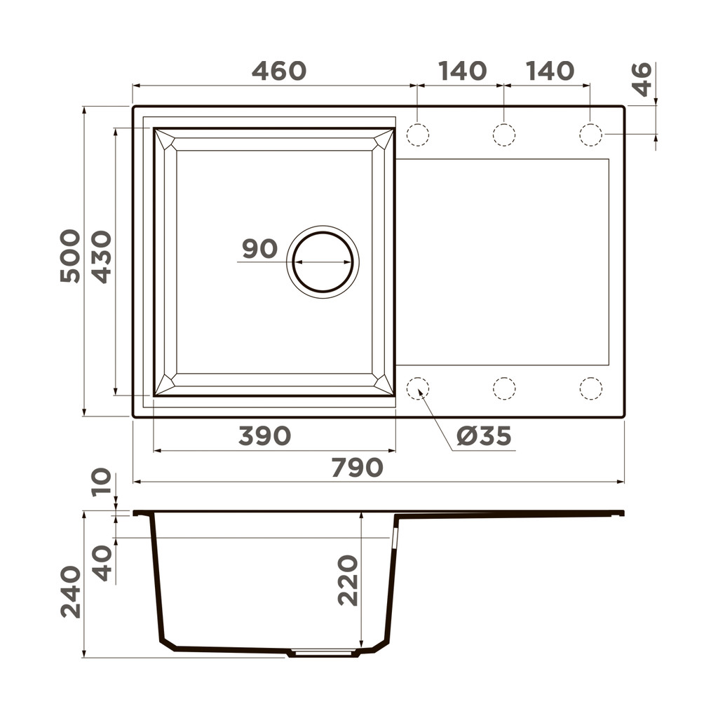 Вырез под мойку: 770x480 мм.