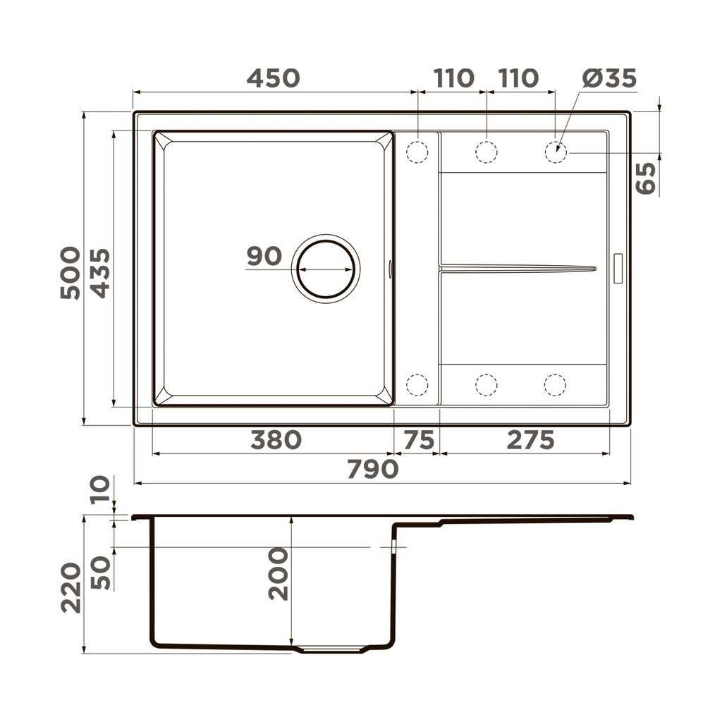 Размер мойки: 790x500