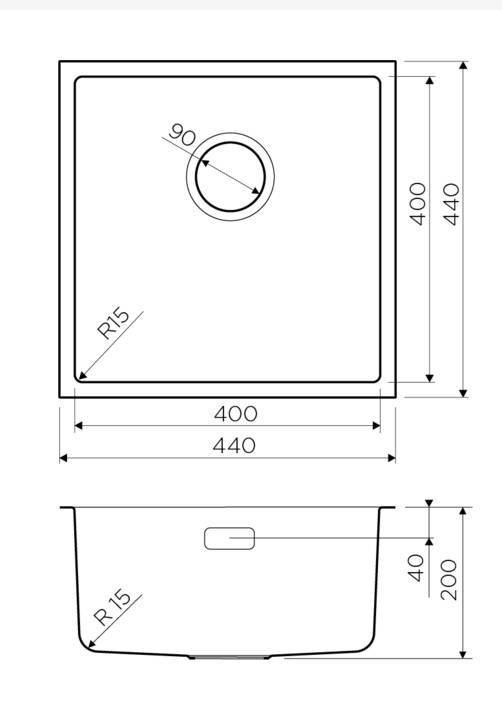 Размер выреза под мойку: 400х400 мм., угловой радиус врезки 25 мм.