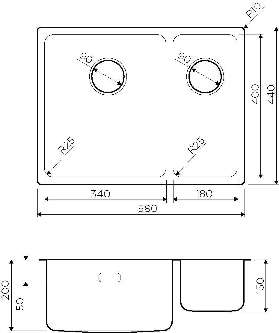 Радиус угла мойки, мм: 25