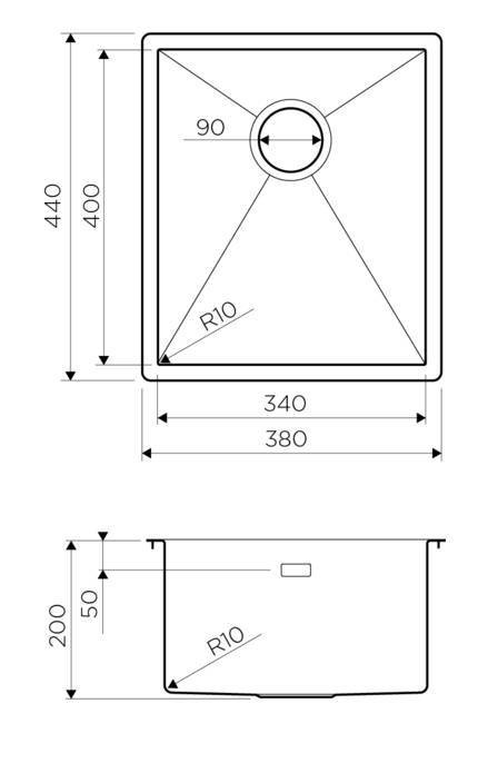 Размер выреза под мойку при монтаже под столешницу: 400х340 мм., угловой радиус врезки 10 мм.