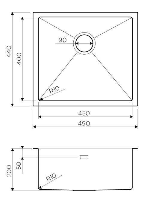 Размер выреза под мойку при монтаже под столешницу: 450х400 мм., угловой радиус врезки 10 мм.