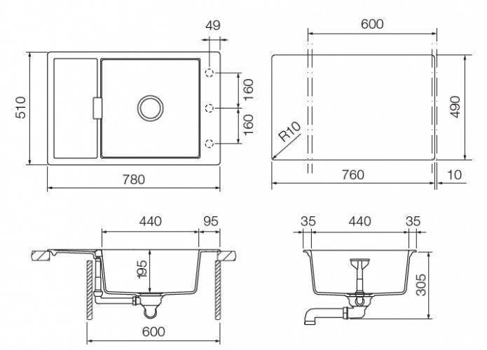 Размер мойки, см 78x51