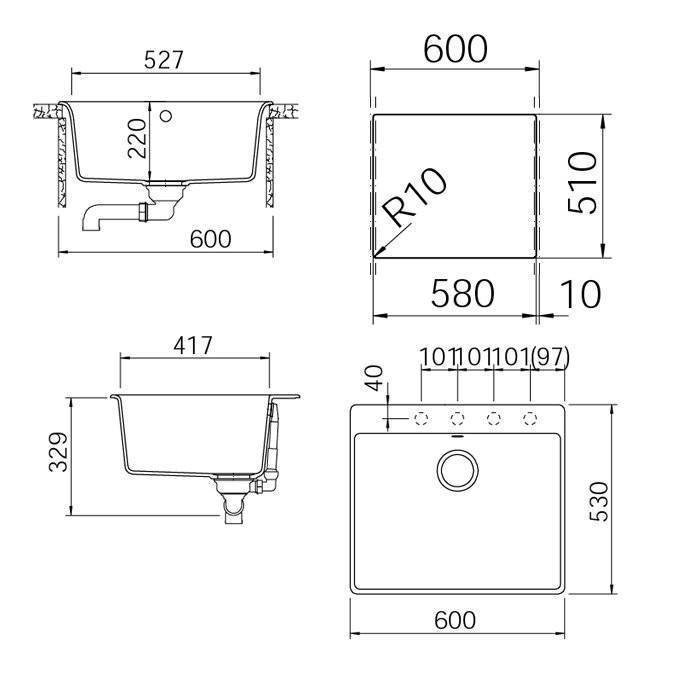 Комплектация: Отводная арматура с клапаном-автоматом 3 1/2" и переливом, сифон с возможностью подключения посудомоечной или стиральной машины.