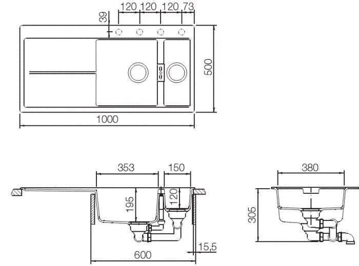 Отводная арматура с переливом и сифоном с возможностью подключения посудомоечной или стиральной машины.