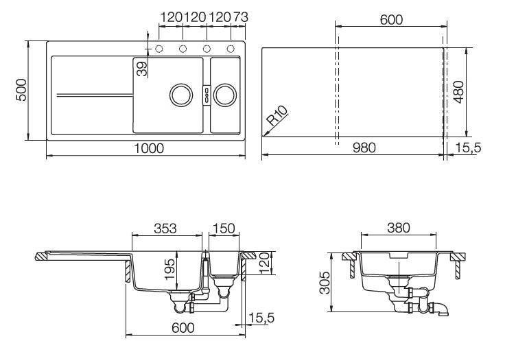 Отводная арматура с переливом и сифоном с возможностью подключения посудомоечной или стиральной машины.