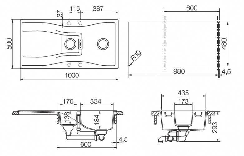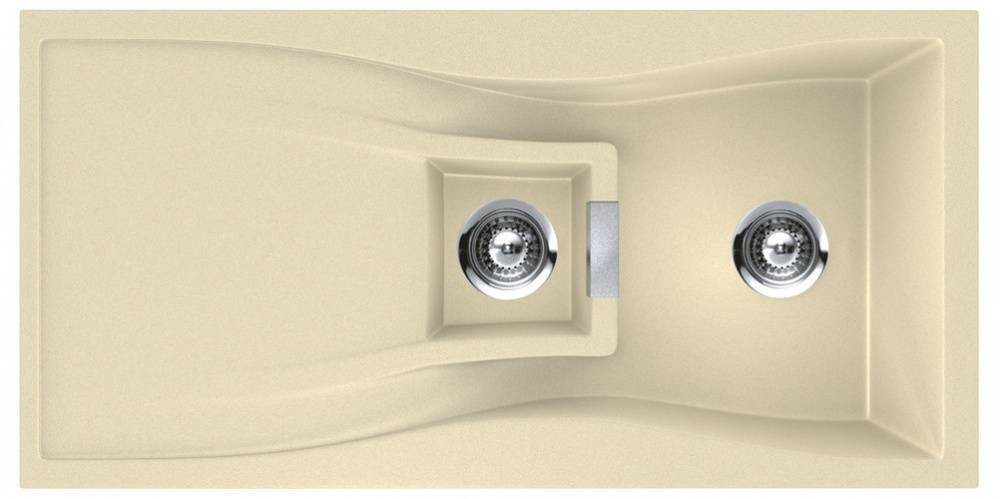 Разделочная доска арт. 629046, коландер из белого пластика арт. 629049, отводная арматура с клапаном-автоматом 3,5 дюйма и переливом для основной чаши, 3,5 дюйма корзинчатый вентиль для дополнительной чаши, сифон с отводом для стиральной или посудомоечной машины, крепеж для врезного монтажа.
