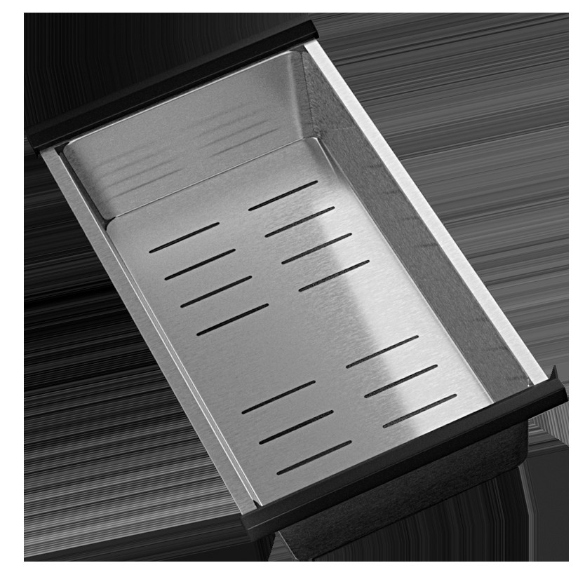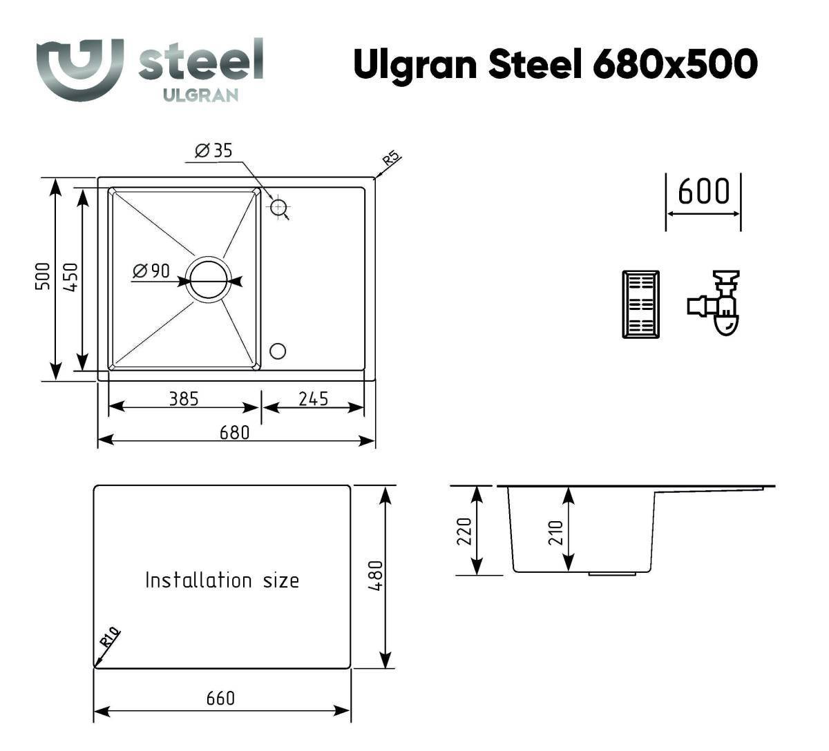 Комплектация включает коландер из хирургической стали AISI 304 (размер 480 *205*75 мм), высококачественная сливная арматура с клапаном-полуавтоматом, отводом для подключения стиральной машины и гофротрубой.