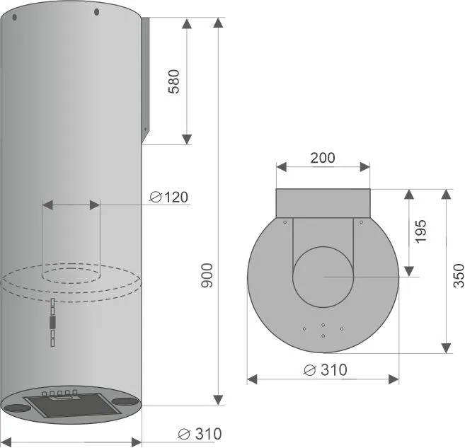Вытяжка состоит из одной части, имеет два выхода для воздуховода - вертикальный и горизонтальный