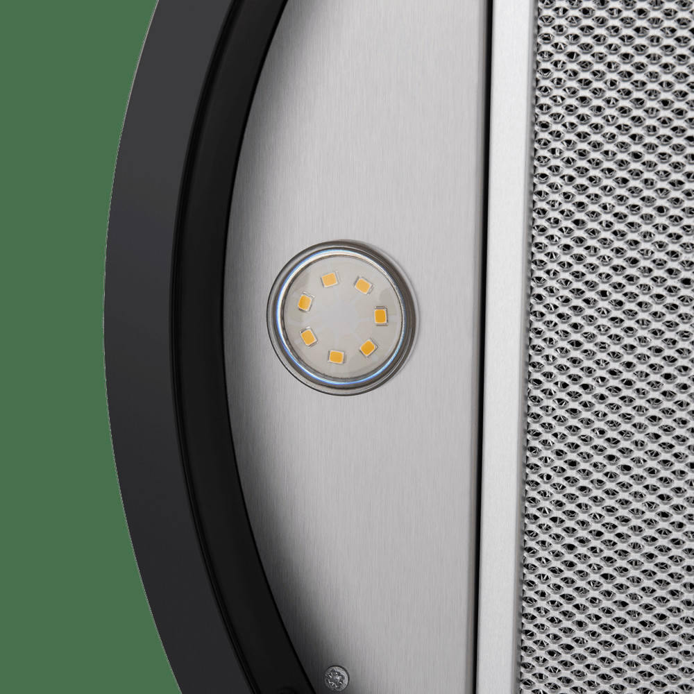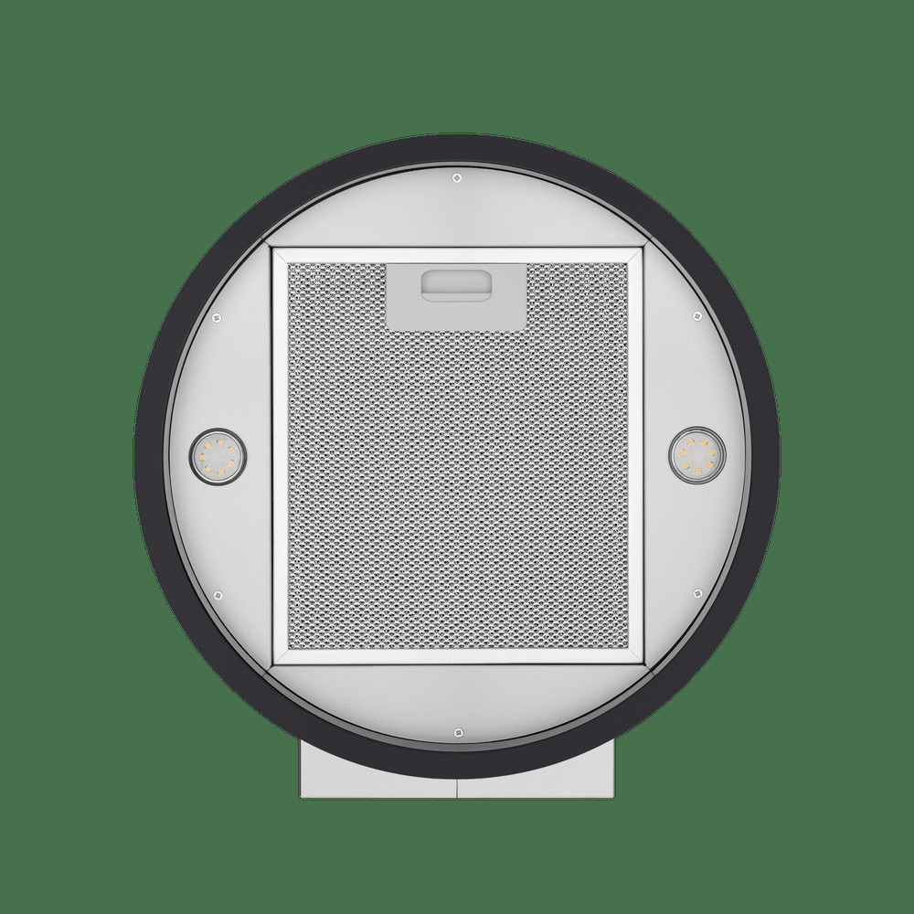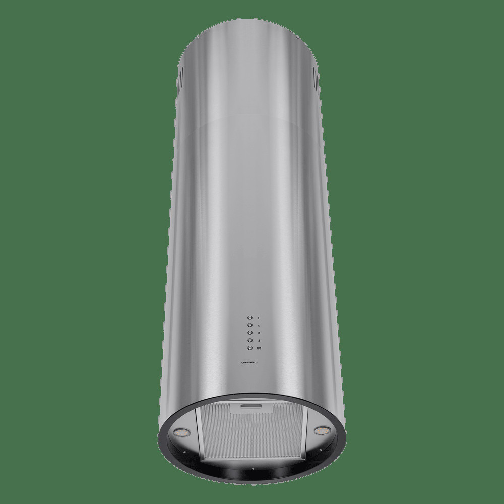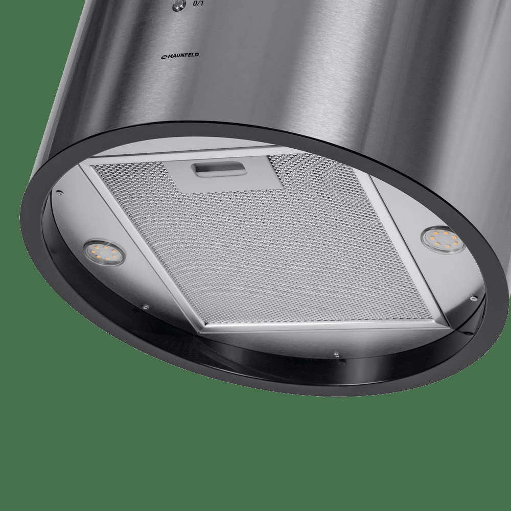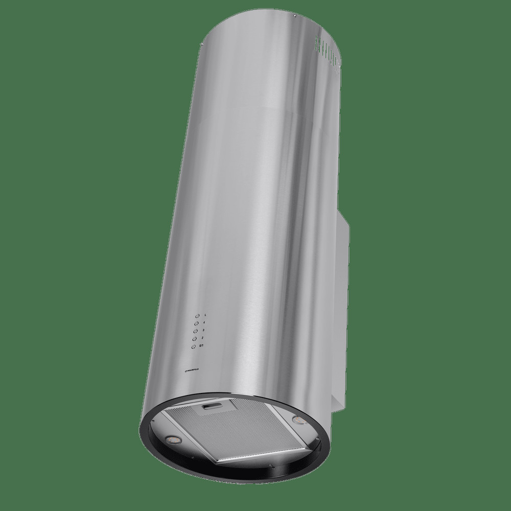 Корпус цилиндрической формы, сделанный из нержавеющей стали с термостойким покрытием, монтируется на стену над варочной поверхностью. Специальный многослойный жироулавливающий алюминиевый фильтр, расположенный в нижнем торце, легко снимается и полностью разбирается, что сильно упрощает его чистку.