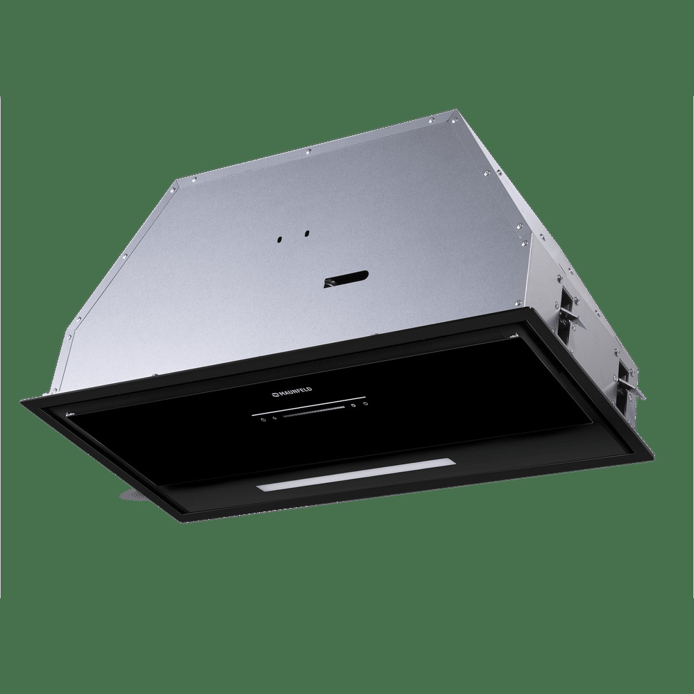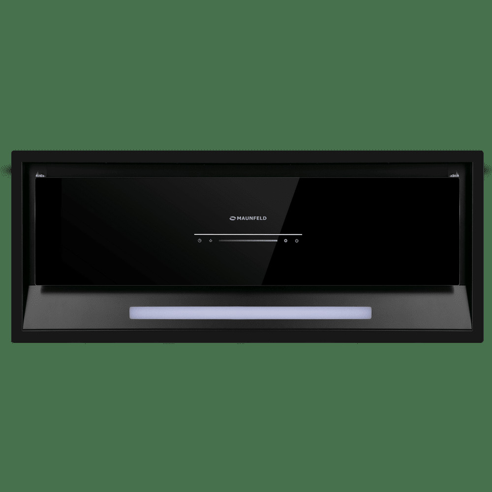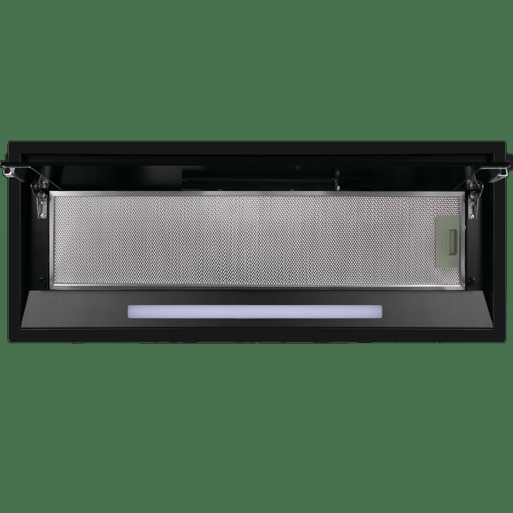 Фронтальная панель выполнена из нержавеющей стали с высококачественным покрытием черного цвета. За откидной панелью из глянцевого закаленного стекла находится многослойный жироулавливающий фильтр, который легко вынимается и полностью разбирается, что сильно упрощает чистку.