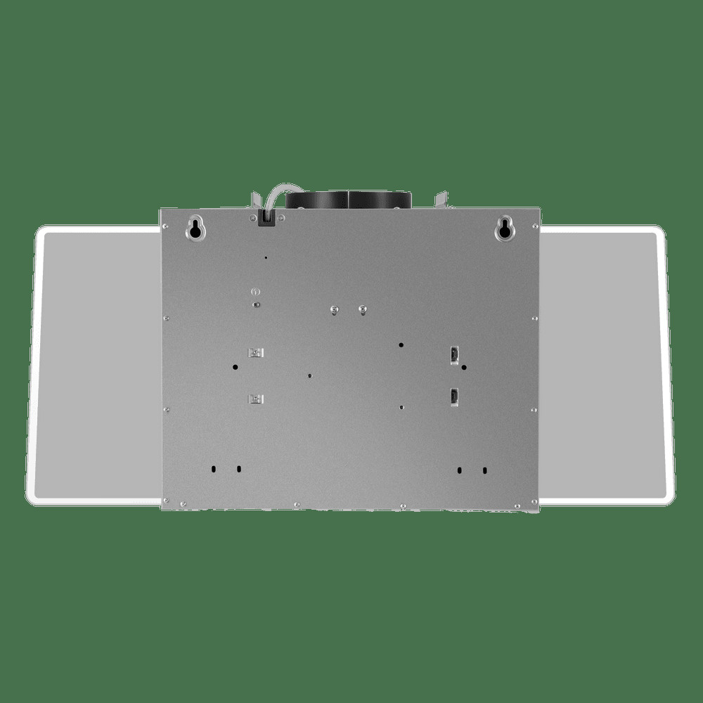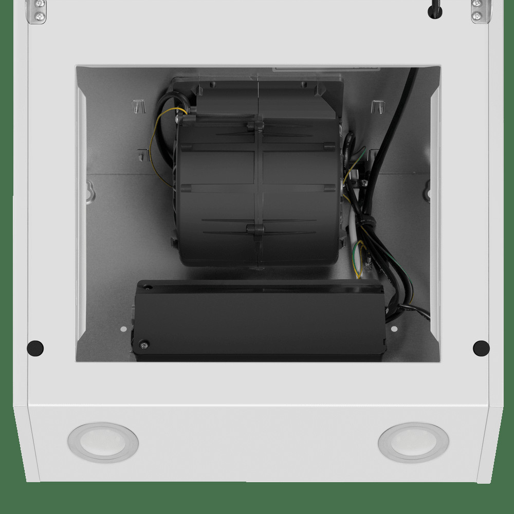 Корпус вытяжки выполнен из металла и стекла, что придает ей современный и стильный вид. Окантовка и панель изготовлены из стекла, что добавляет изысканности и элегантности.